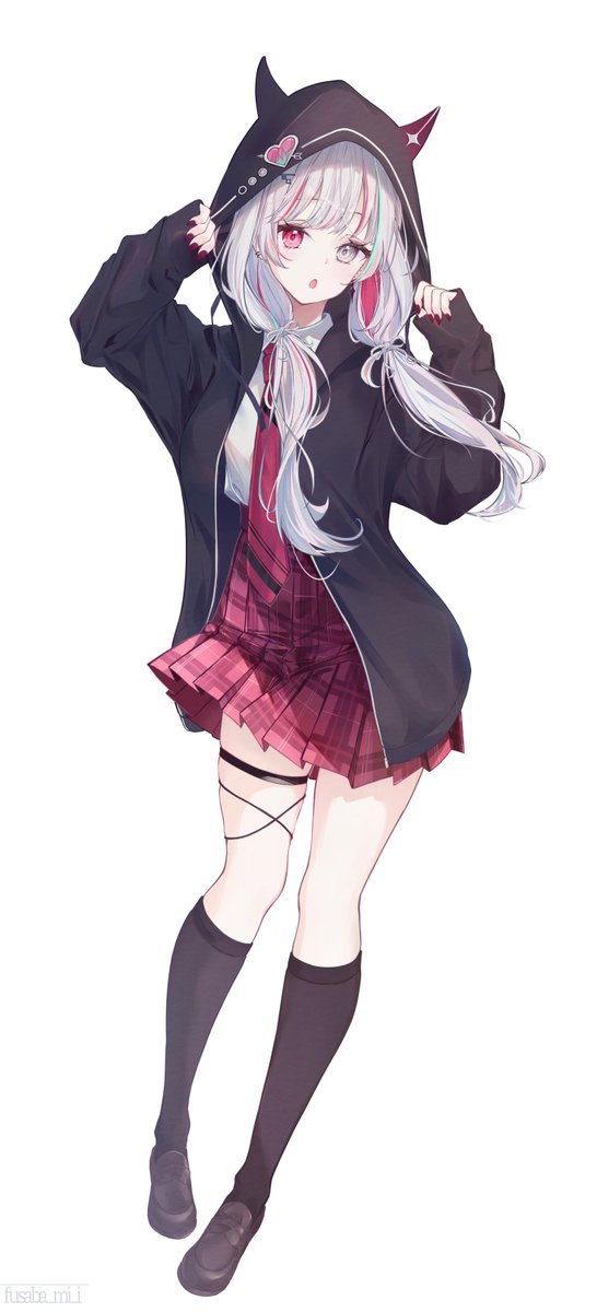 1girlblack jacketblack sockscollared shirtfull bodygrey eyesgrey hairhands upheterochromiahoodhooded jacketjacketkneehighsloaferslong hairlong sleeveslooking at viewermulticolored hairnecktieopen clothesopen jacketparted lipspink eyespink hairschool uniformshirtshoessimple backgroundskirtsockssolostandingthigh strapvirtual youtuberwhite backgroundwhite shirt