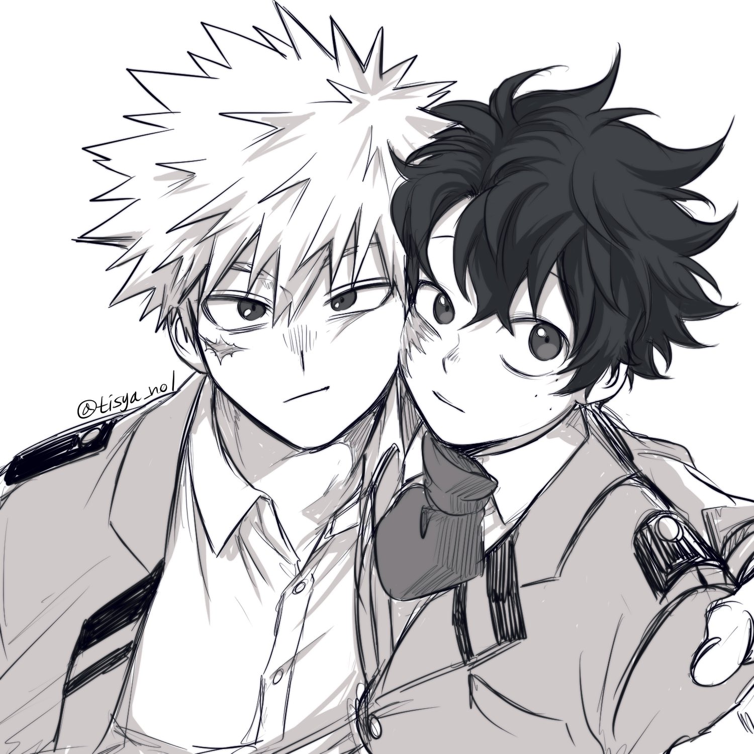 2boyscheek-to-cheekcollared shirtdress shirtfacial scarfrecklesgreyscalehair between eyesheads togetherjacketlapelslong sleeveslooking at viewerlooking to the sidemale focusmonochromemultiple boysnecktienotched lapelsopen clothesopen collaropen jacketscarscar on cheekscar on faceschool uniformshirtshort hairsideways glancesimple backgroundsketchspiked hairtisya no1twitter usernameu.a. school uniformupper bodywhite backgroundwing collar