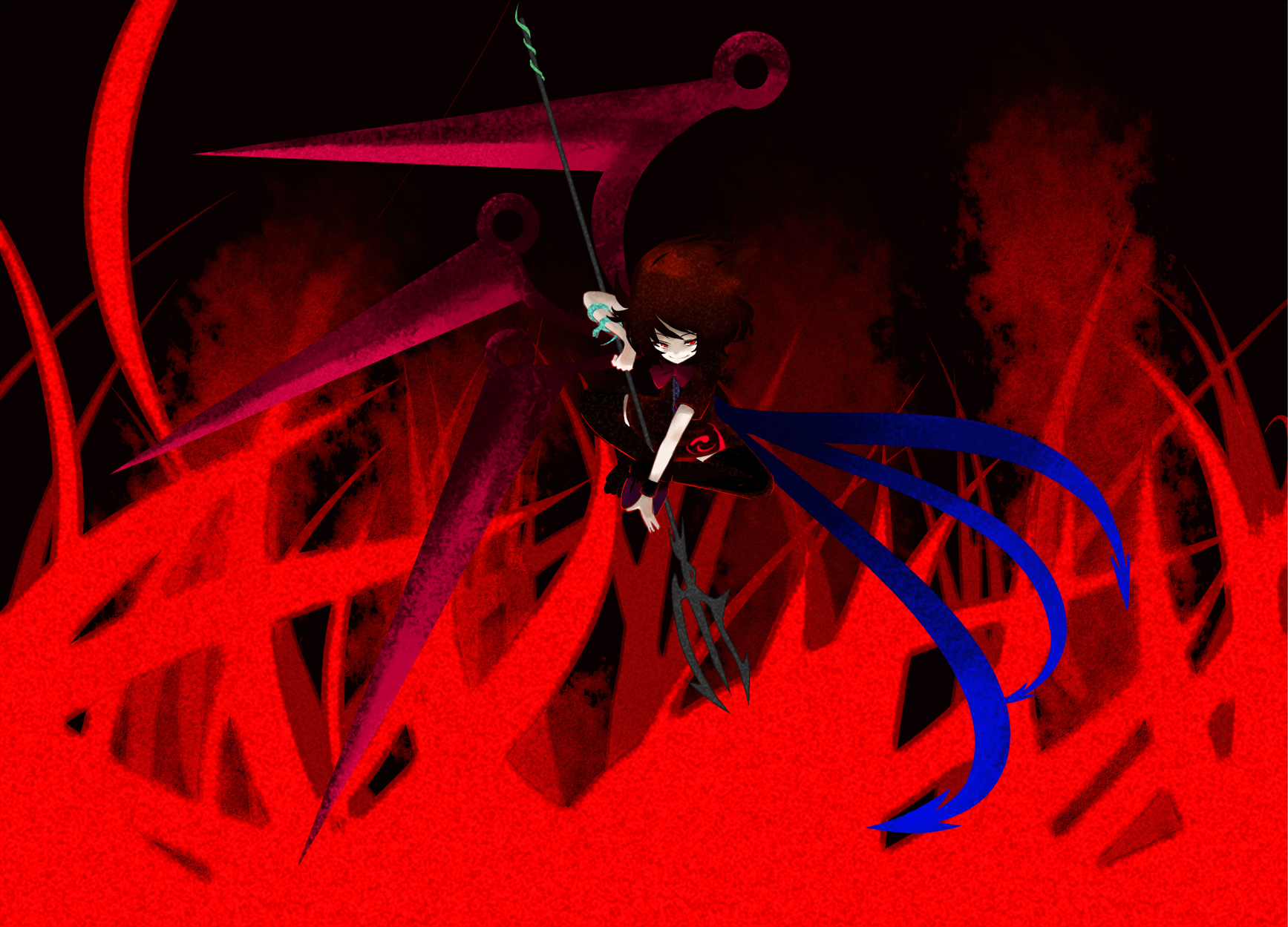 1girlblack hairblack thighhighsfemale focuspolearmred eyesred themeshort hairsnakesolospearthighhighstridentweaponwingszettai ryouiki