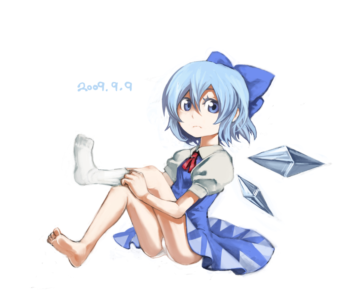 1girlbarefootblue eyesblue hairbowcircled 9feetfemale focusmatching hair/eyespantiesshort hairsingle socksockssolounderwearwings