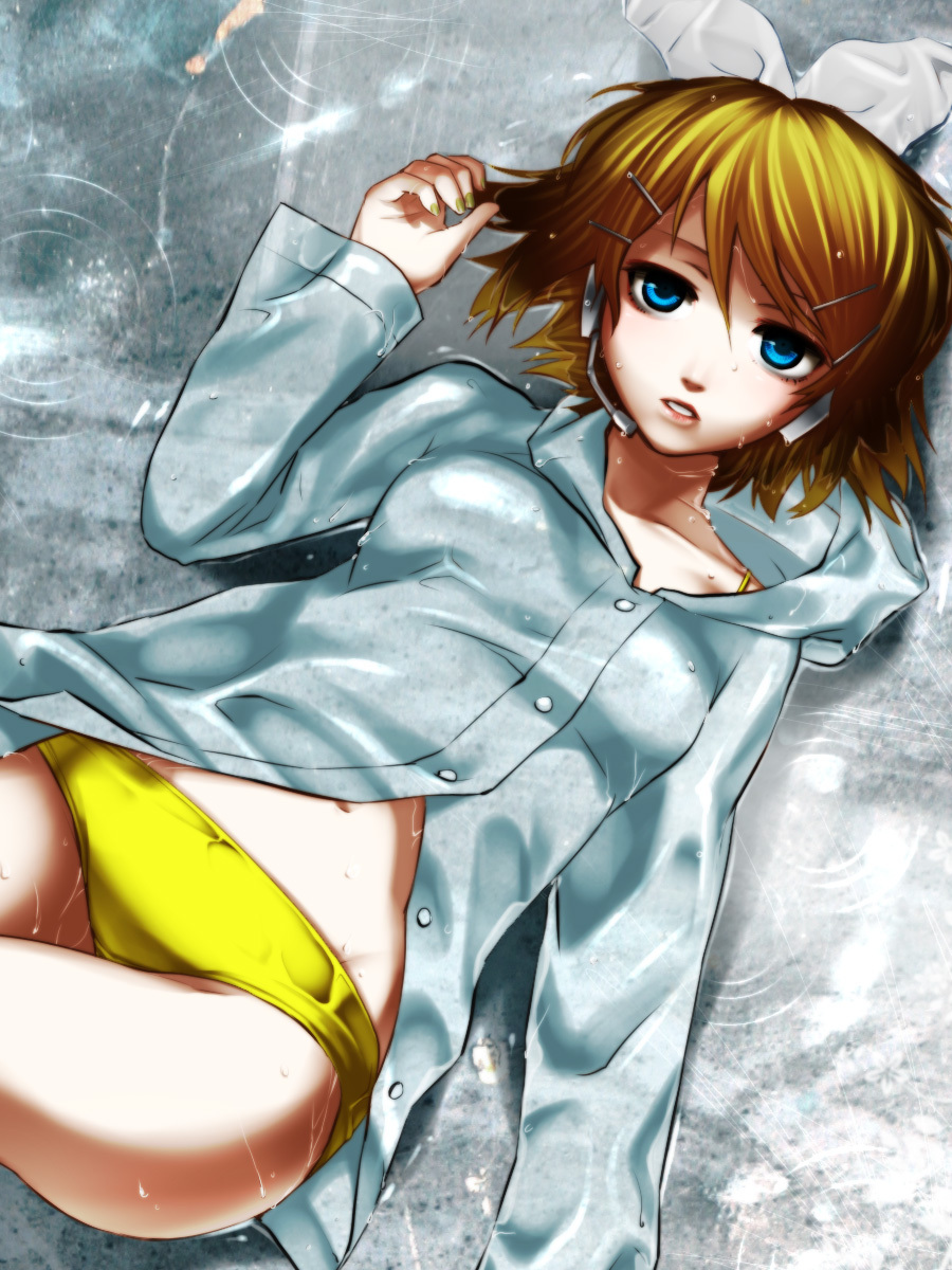 1girlblonde hairblue eyesfemale focushair ornamenthair ribbonhairclipheadphonesheadsethoodhoodielyingnavelon backpantiesrainribbonshort hairsolounderwearyellow panties