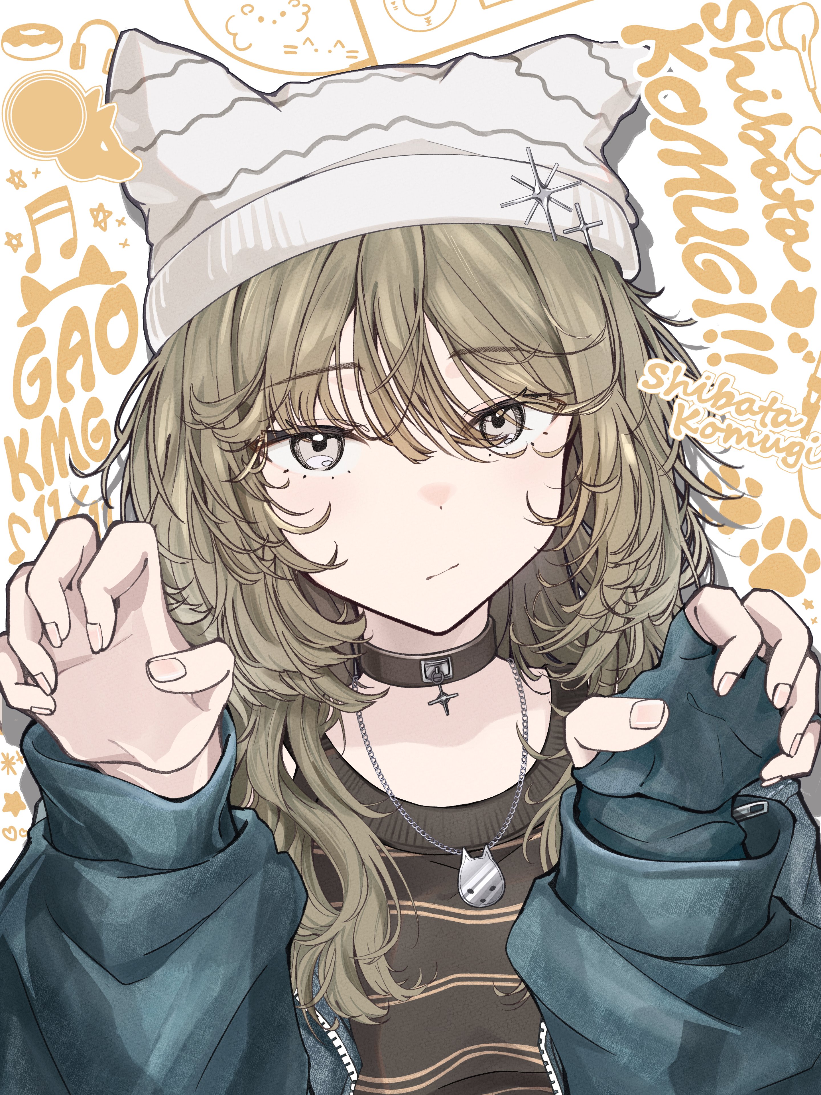 1girlanimal ear headwearbeanieblack chokerblack shirtblue glovesblue jacketbrown haircharacter namechokerclaw poseclosed mouthfake animal earsfingerless glovesfingernailsglovesgrey eyeshair between eyeshands uphatjacketjewelrylong hairlong sleeveslooking at viewernecklaceopen clothesopen jacketshibata komugishirtsingle fingerless glovesingle glovesolostriped clothesstriped shirtswept bangsupper bodyvirtual youtuberwhite hat