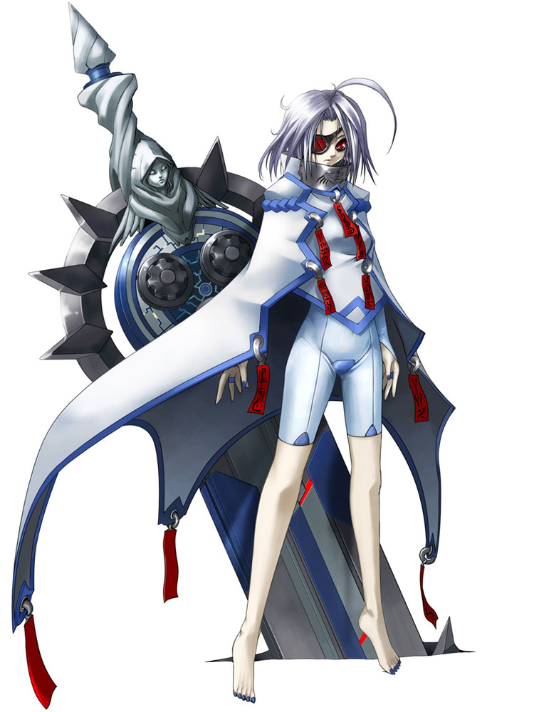 1girlahogeandroidbarefootblue nailsbridal gauntletscapeeyepatchfeetfemale focusflat chestfrownfull bodyhuge weaponlegsnail polishofudapale skinred eyesshort hairsimple backgroundsolostandingstatueswordtiptoestoenail polishtoenailsunitardweapon