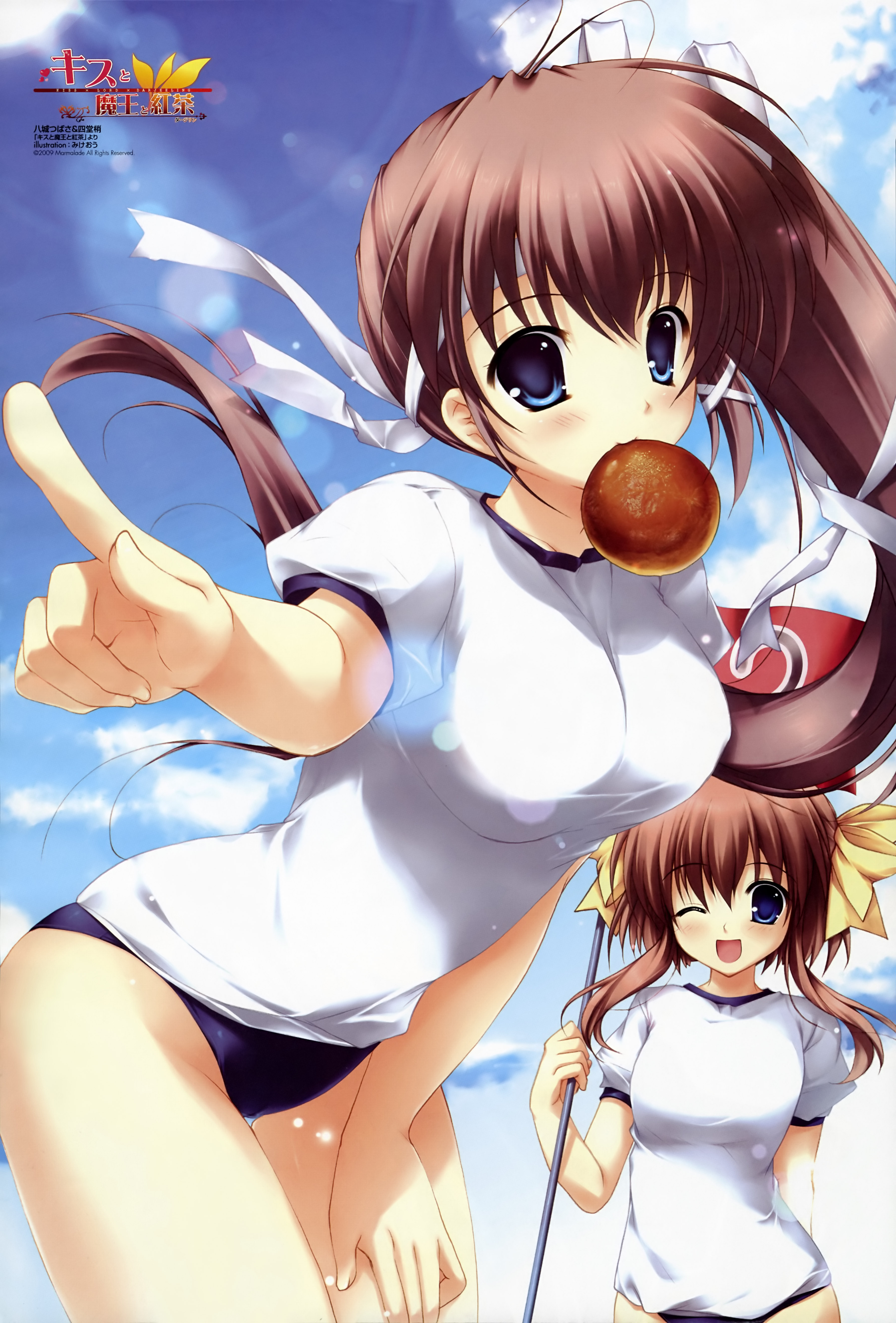 :d2girlsblue burumablue eyesblushbreadbrown hairburumafoodfood in mouthgym uniformhair ribbonleaning forwardlong hairmouth holdmultiple girlsnumbered flagone eye closedopen mouthpointingponytailribbonshort sleevessmilewink