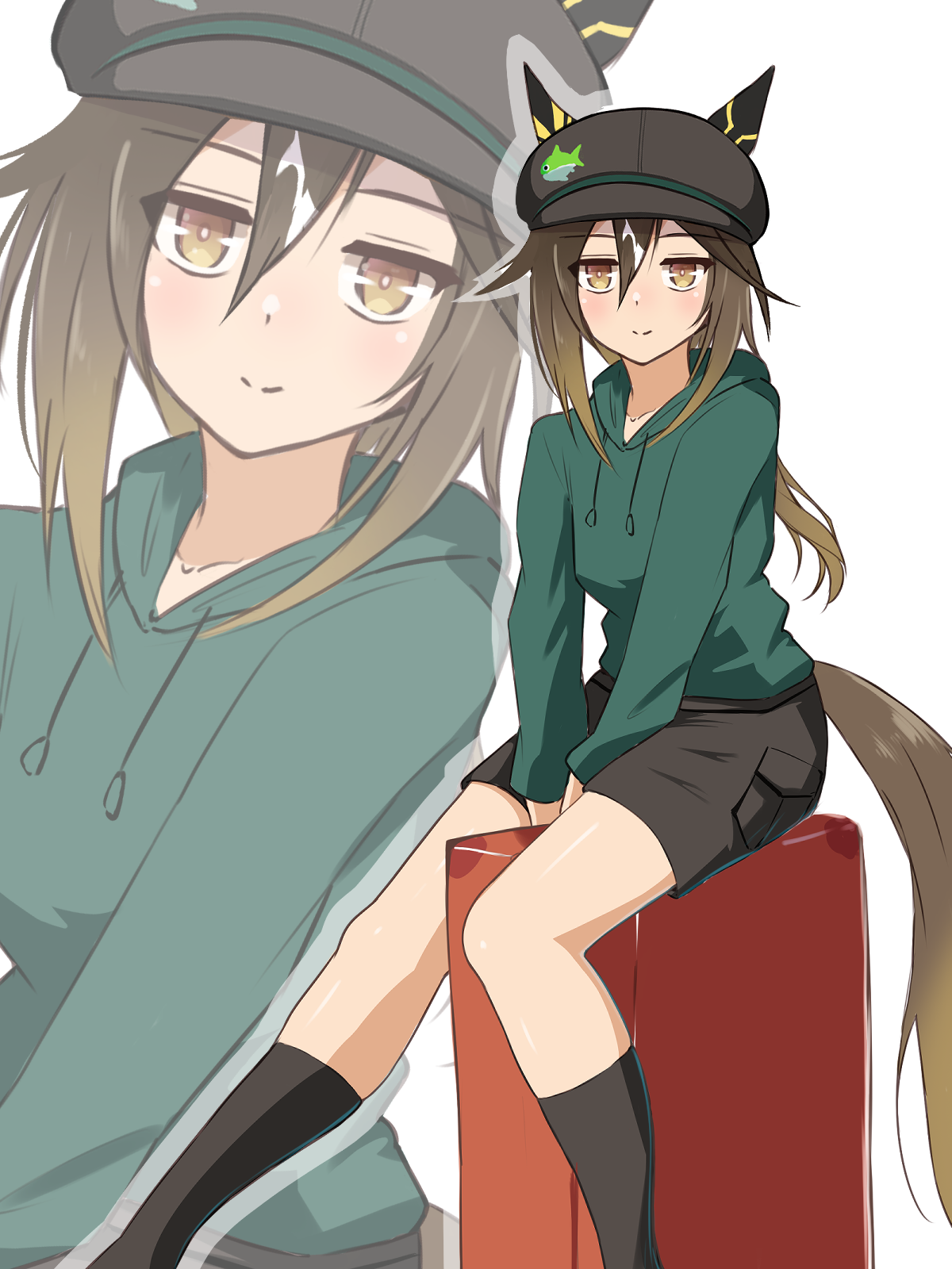 1girlanimal earsblack hairblack shortsblack socksblushbrown eyesbrown haircasualclosed mouthear coversears through headweargreen hoodiehair between eyeshathoodhood downhoodiehorse earshorse girlhorse taillong hairlong sleeveslooking at viewermulticolored hairshortssittingsmilesockssolostreaked hairtailwhite hairzoom layer
