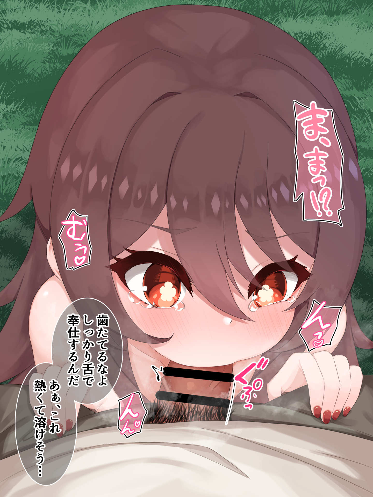 1boy1girlbar censorbreastsbrown haircensoredcollarboneflower-shaped pupilsgrasslong hairpantspenisred eyesred nailsshirtsolospeech bubblesymbol-shaped pupilstearing uptwintails