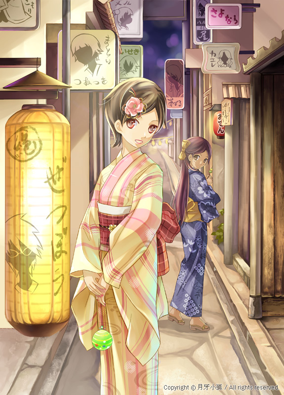00s2girlsblack hairbrown hairflowerjapanese clotheskimonomultiple girlspurple hairred eyesshort hairyukata