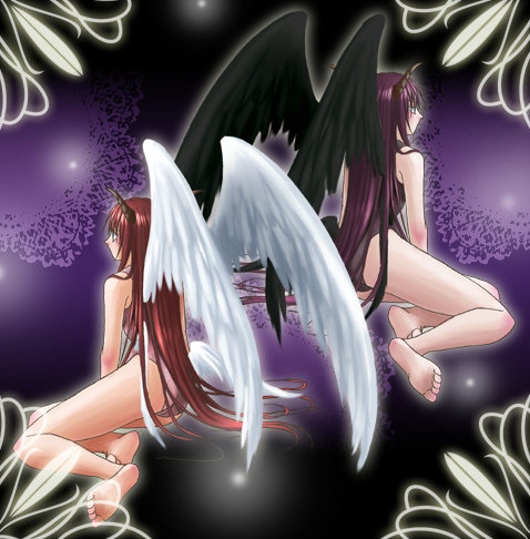 2girlsangel wingsassbarefootblack wingsbreastsbrown hairfeethornsleotardmultiple girlspurple hairred eyesred hairwings