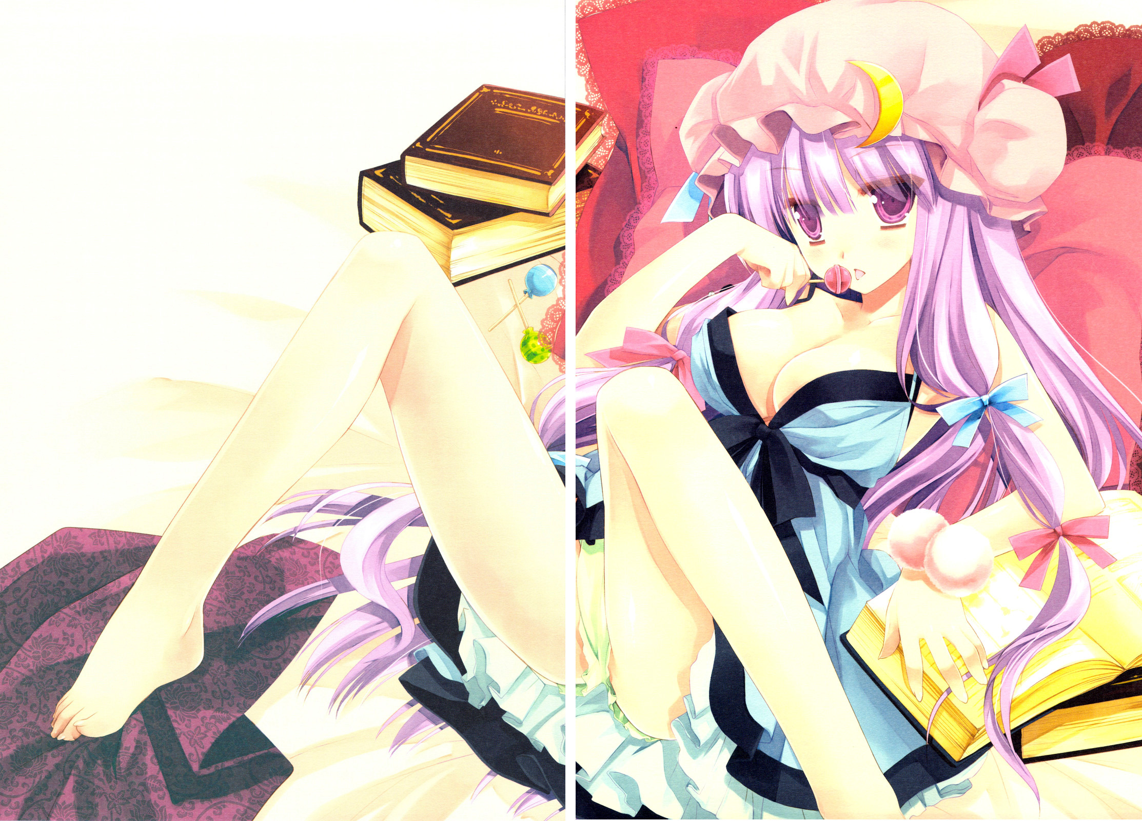 1girlbarefootbookbreastscandycleavagefeetfemale focusfoodgradient backgroundhair ribbonhatlarge breastslegslollipoplong hairpantiespantyshotpurple eyespurple hairribbonsolothighsunderwearwhite background