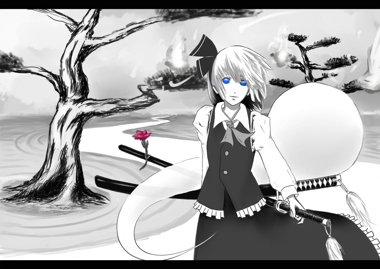 1girlblue eyesfemale focusflowerghosthitodamakatanaletterboxedmonochromesolospot colorswordweapon