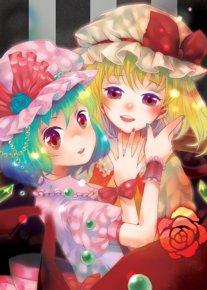 2girlsbat wingsblonde hairblue hairfemale focushatmultiple girlsone side upponytailred eyesshort hairsiblingsside ponytailsisterswings
