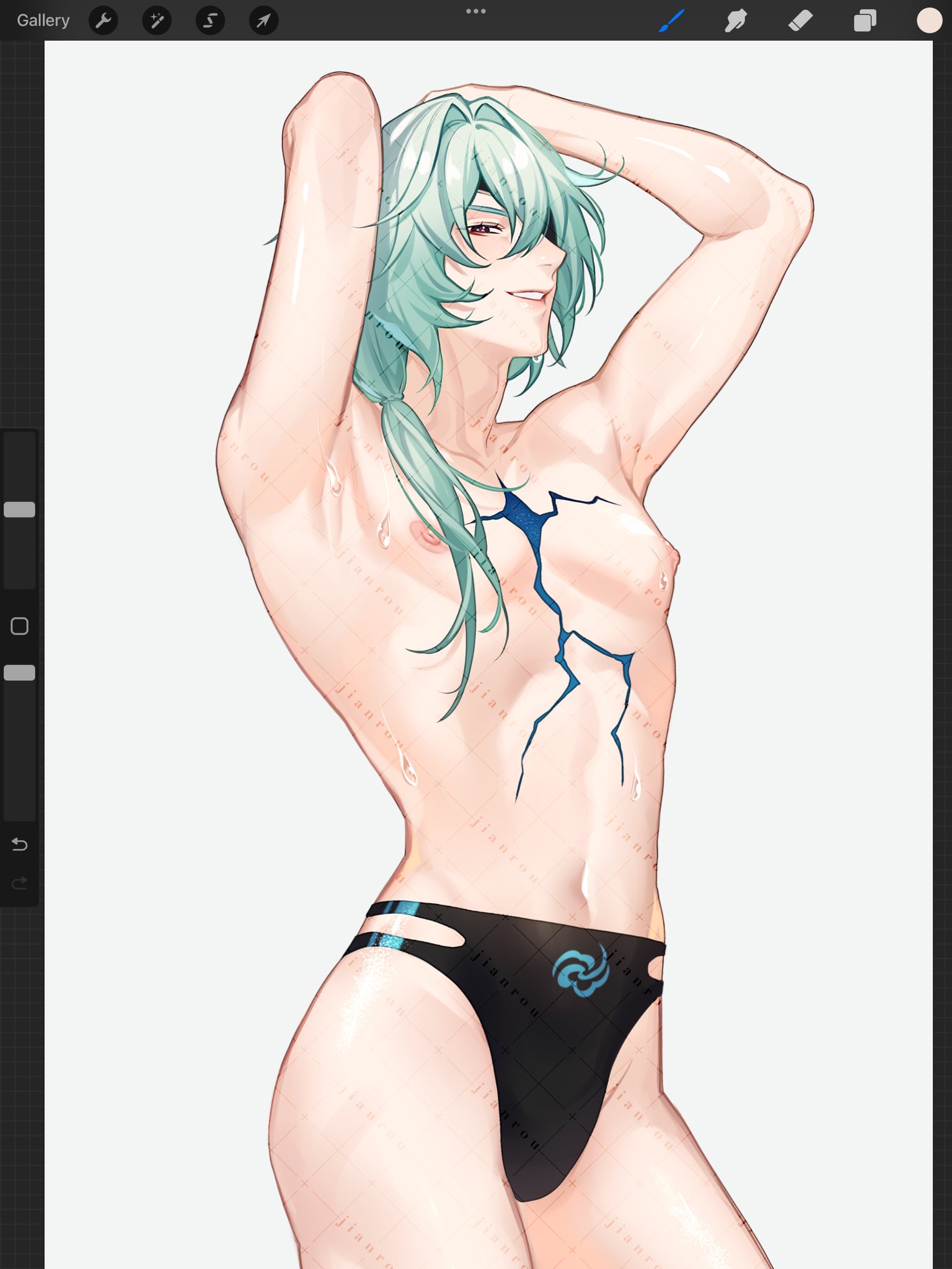 1boyaqua hairarms behind headarms upblack male swimwearbulgeeyepatchhair between eyeslong hairmale focusmale swimwearnavelnipplessmilesolostomachtopless male