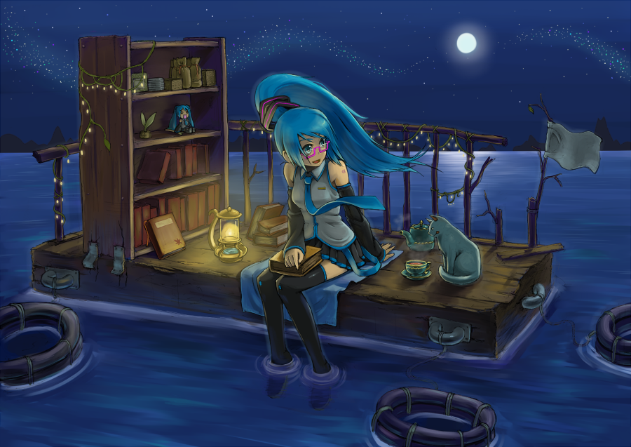 aqua eyesaqua hairbookcatcupdetached sleevesfull moonglasseslamplifebuoylong hairmoonnecktienightponytailsittingskirtsmilesoaking feetsoloswim ringteathighhighswaterzettai ryouiki