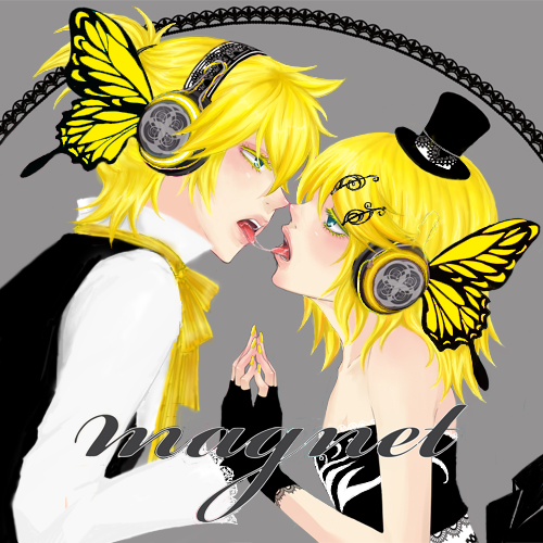 1boy1girlaqua eyesblonde hairbrother and sisterbutterfly wingsface-to-facefingerless glovesgloveshair ornamenthairclipheadphonesheteroincestinsect wingsnail polishsalivasaliva trailshort hairsiblingstwincesttwinswingsyellow nails