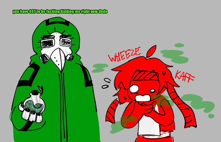 colored skinearclacksenglish textflaskflask (earclacks)gas maskhazmat suitholdingholding flaskholding weaponmaskpersonificationred skinspeedy (earclacks)weapon