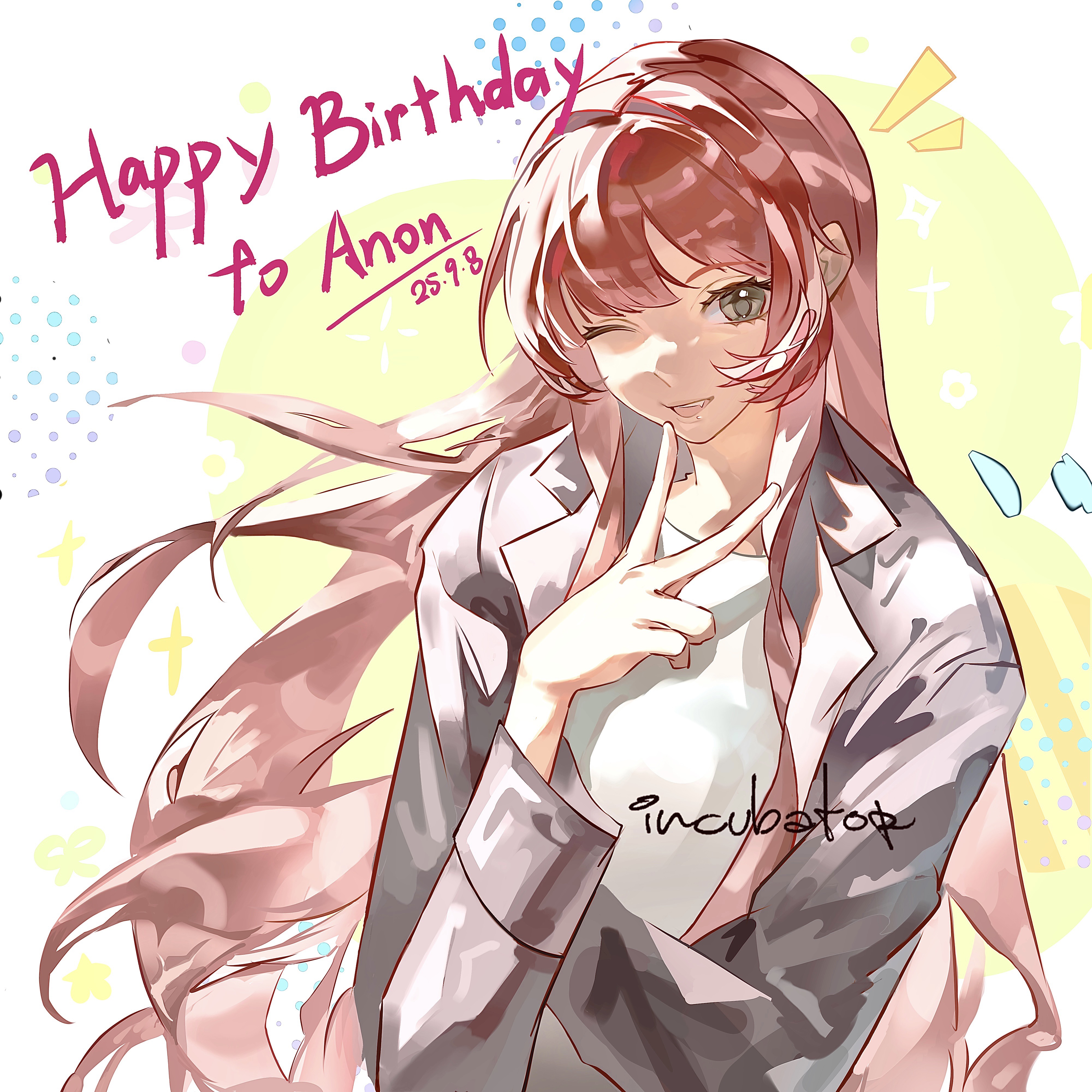 :d1girlblack jacketcharacter namedatedfanggrey eyeshappy birthdayinward vjacketlong hairlong sidelockslong sleeveslooking at viewernotice linesone eye closedopen clothesopen jacketopen mouthred eyesshirtsidelockssmilesoloupper bodyvvery long hairwhite shirtwu fuzuoyong