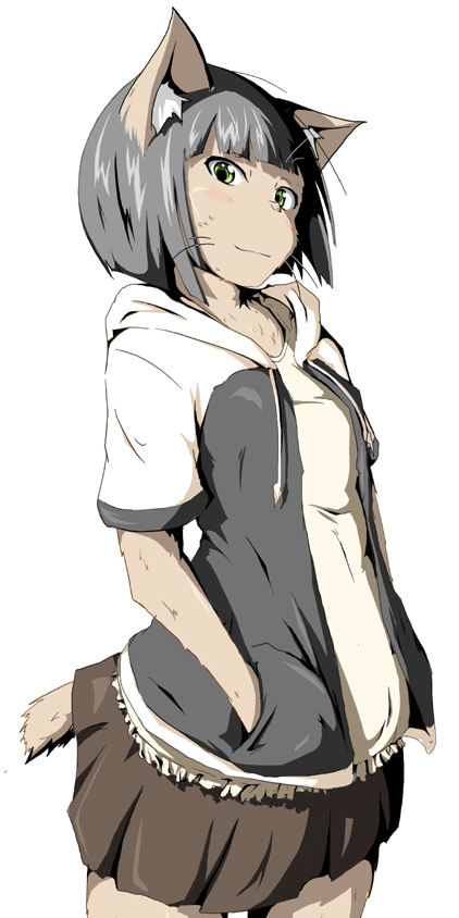 1girlanimal earsblunt bangscat earscat girlcat tailfemale focusfurryfurry femalegreen eyeshands in pocketshoodhoodielooking at viewersimple backgroundskirtsmilesolotailwhiskerswhite background