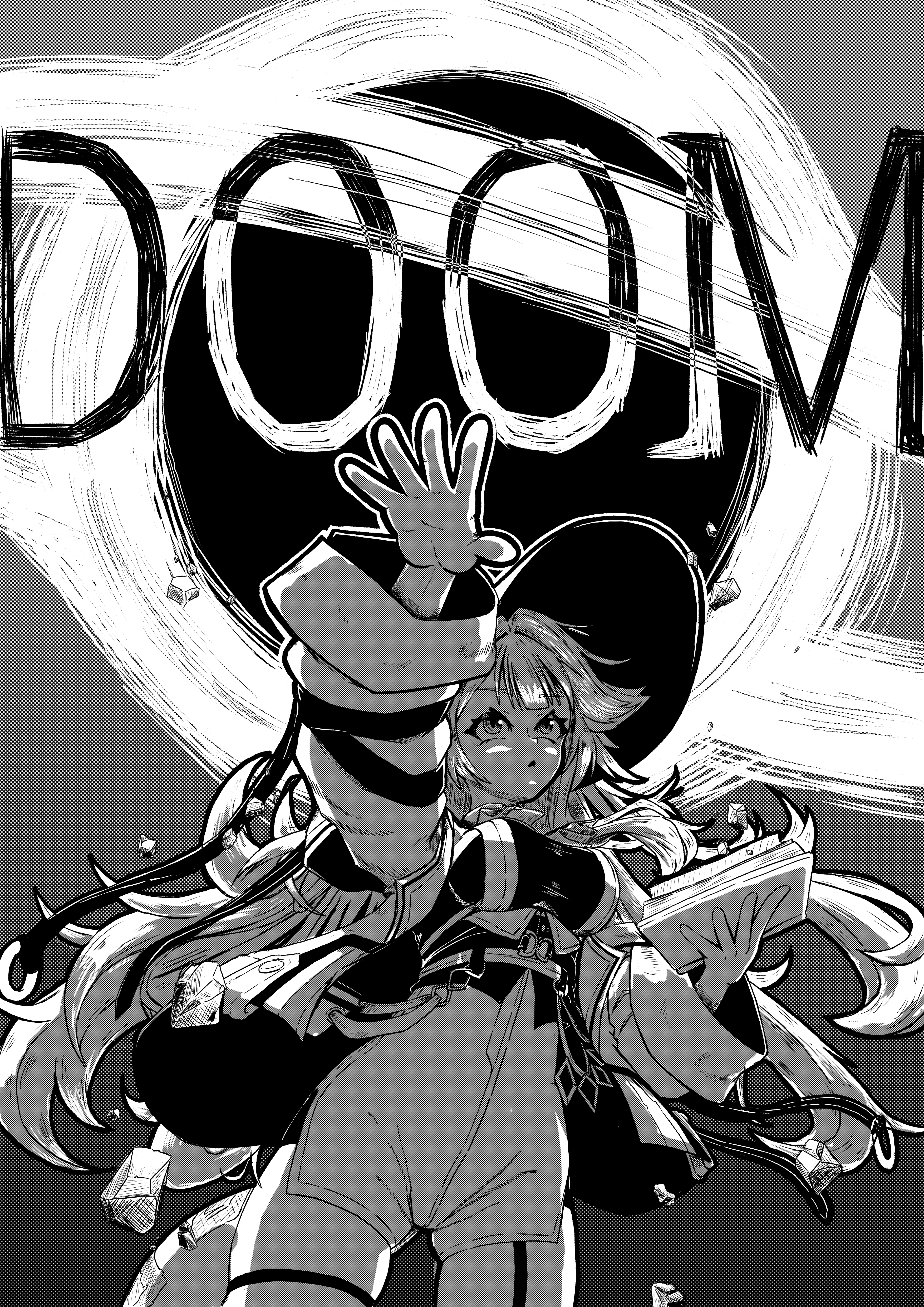 1girlblack holebookbreastsenglish texteyelashesfettuccinebrogreyscalehigh-waist shortsholdingholding bookjacketlong hairlong sleevesmage arenamonochromeopen clothesopen jacketopen mouthoutstretched armshirtshortssolovirtual youtuber