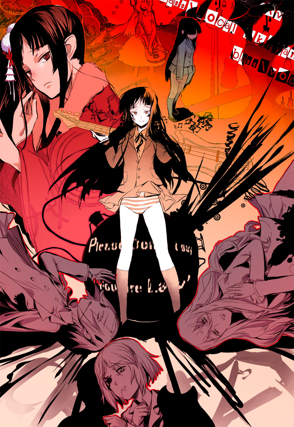 00sblack hairbloodelectric guitargibson les paulguitarho-kago tea timeinstrumentlegslong hairlyingmustang (guitar)pantiesstriped clothesstriped pantiesunderwear