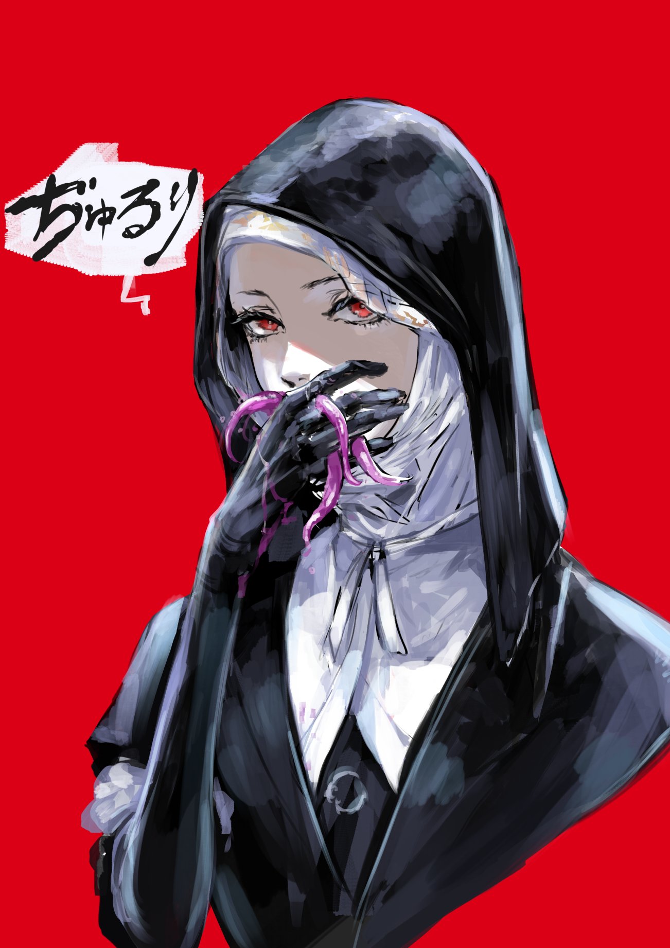 1girlblack capeletblack glovesblack hoodcapeletcoifcovering own mouthcropped torsoelbow glovesgloveshand over own mouthjewelrylooking at viewermacenecklacenunred backgroundred eyessolosound effectstentaclesweaponwhite coif