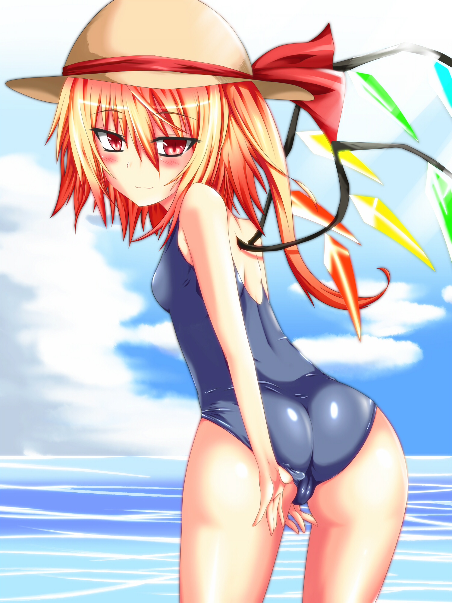 1girladjusting clothesadjusting swimsuitassbare shouldersblushbreastscameltoefemale focushatlooking backnaughty faceone-piece swimsuitred eyesred hairschool swimsuitside ponytailsmall breastssoloswimsuitwaterwings