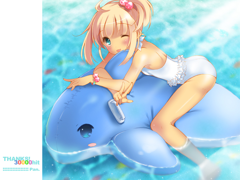 1girlblonde hairblue eyescasual one-piece swimsuitfemale focusfishinflatable dolphininflatable toyone eye closedone-piece swimsuitponytailshort ponytailside ponytailsolostraddlingswimmingswimsuitthank youtonguetoyvwaterwhite one-piece swimsuitwink