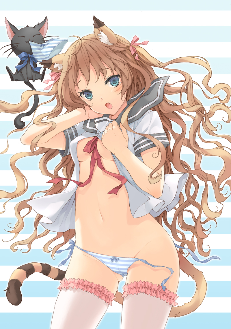 1girlanimal earsblue eyesbreastsbrown haircatcat earscat tailcleavagefemale focuslong hairmedium breastsopen clothesopen shirtpantiespink thighhighsshirtside-tie pantiessolostriped clothesstriped pantiestailthighhighsunderboobunderwearwardrobe malfunction