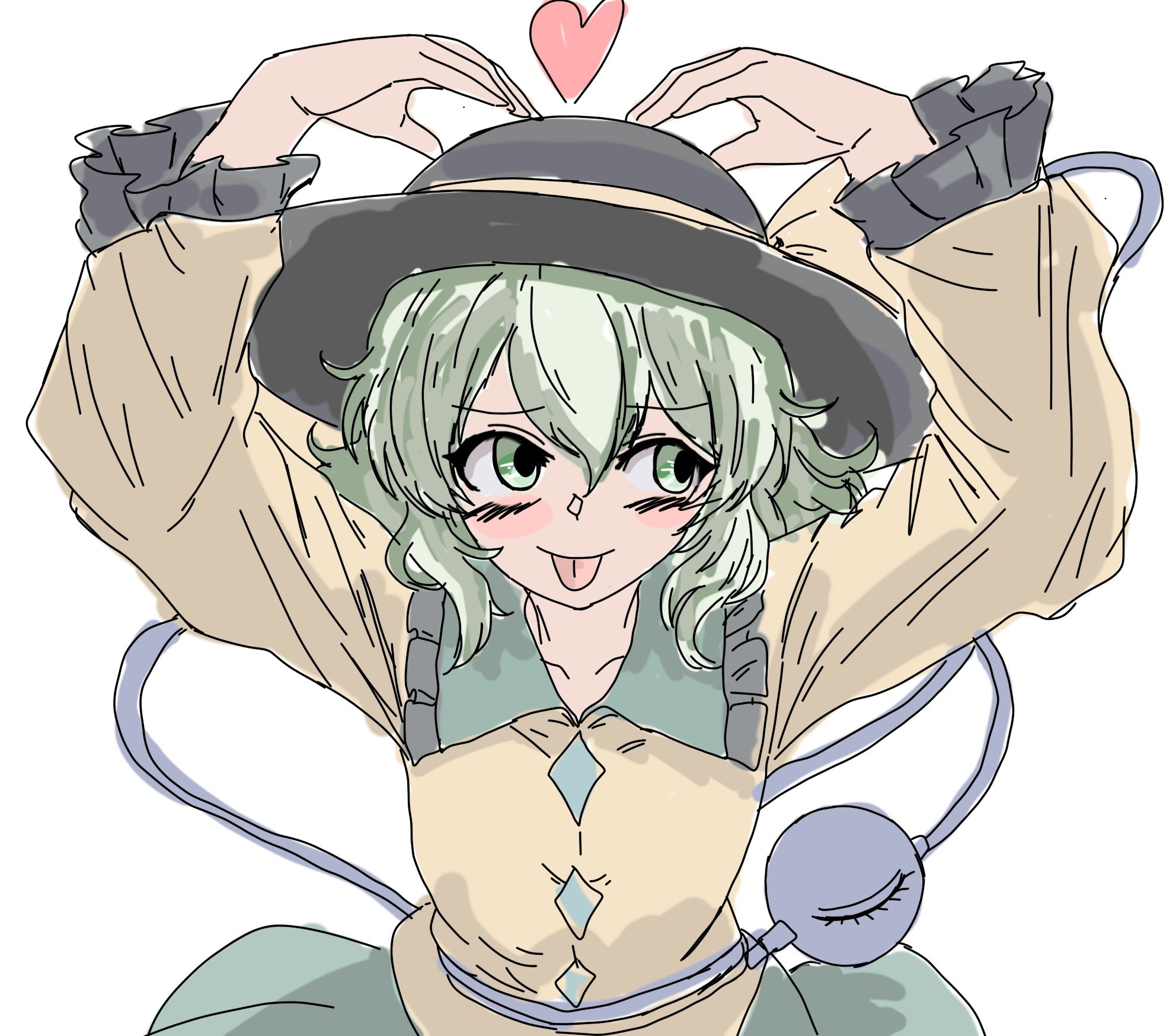 1girlblack hatblushbowbuttonsdiamond buttoneyeballfrilled shirt collarfrilled sleevesfrillsgreen eyesgreen hairgreen skirthathat bowhat ribbonheartheart armsribbonshirtskirtthird eyetonguetongue outwhite backgroundyellow bowyellow ribbonyellow shirt
