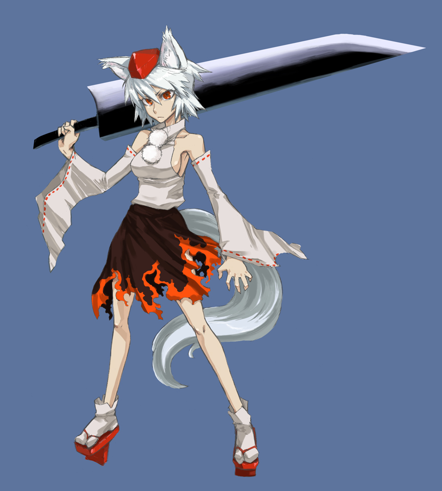 1girlanimal earsdetached sleevesfemale focusgetahatorange eyesshort hairsoloswordtailtengu-getatokin hatweaponwolf earswolf tail