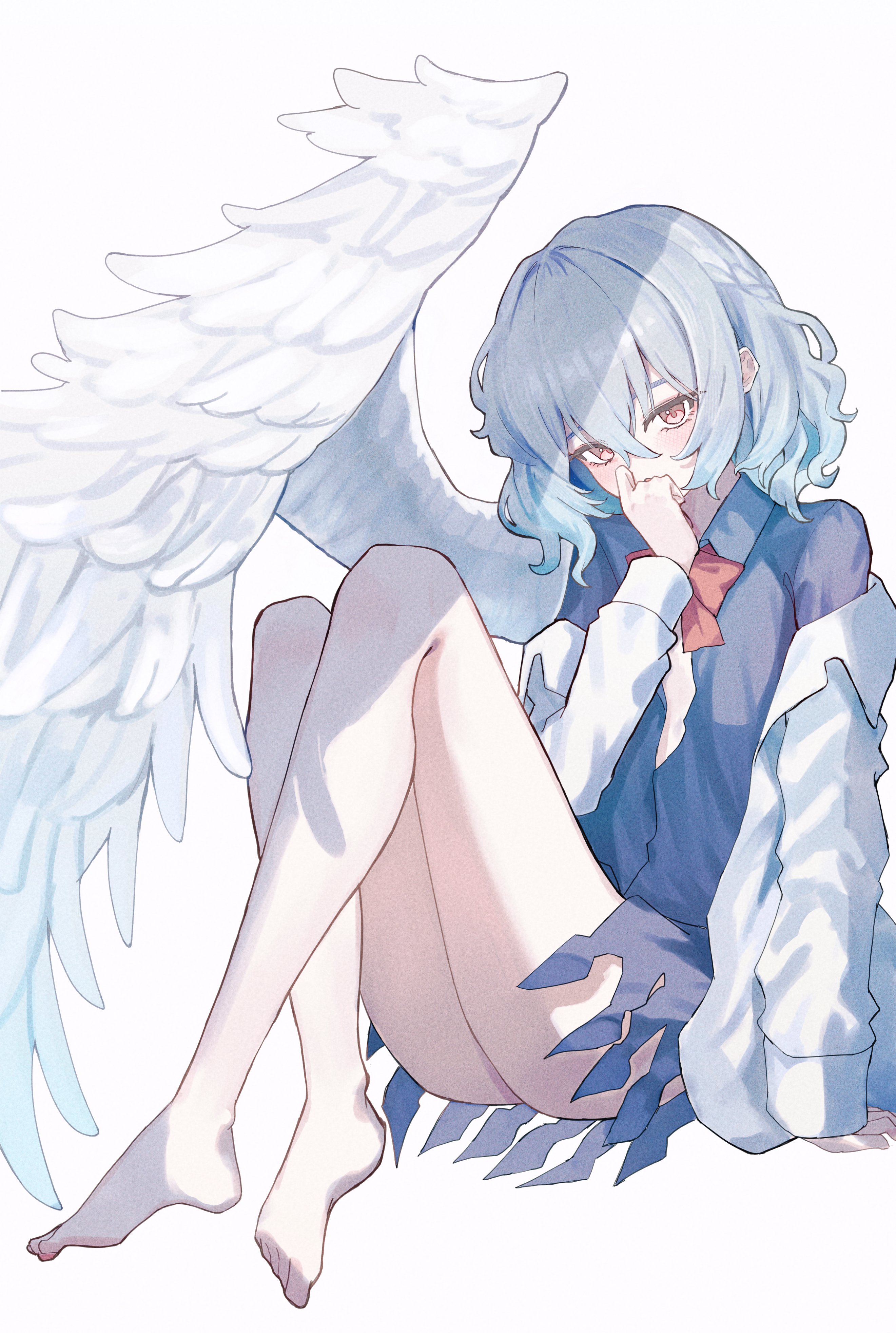 1girlbarefootblue shirtbowbowtiecollared shirtcovering own mouthcrossed anklesfeathered wingsfeetfull bodyhand on own facehand uplegs uplong sleeveslooking at viewerofficial alternate hairstylered bowred bowtiered eyesshirtshirt partially removedshort hairsimple backgroundsingle wingsittingsleeve cuffssleeves past wristssolotoeswhite backgroundwhite hairwhite shirtwhite wingswings
