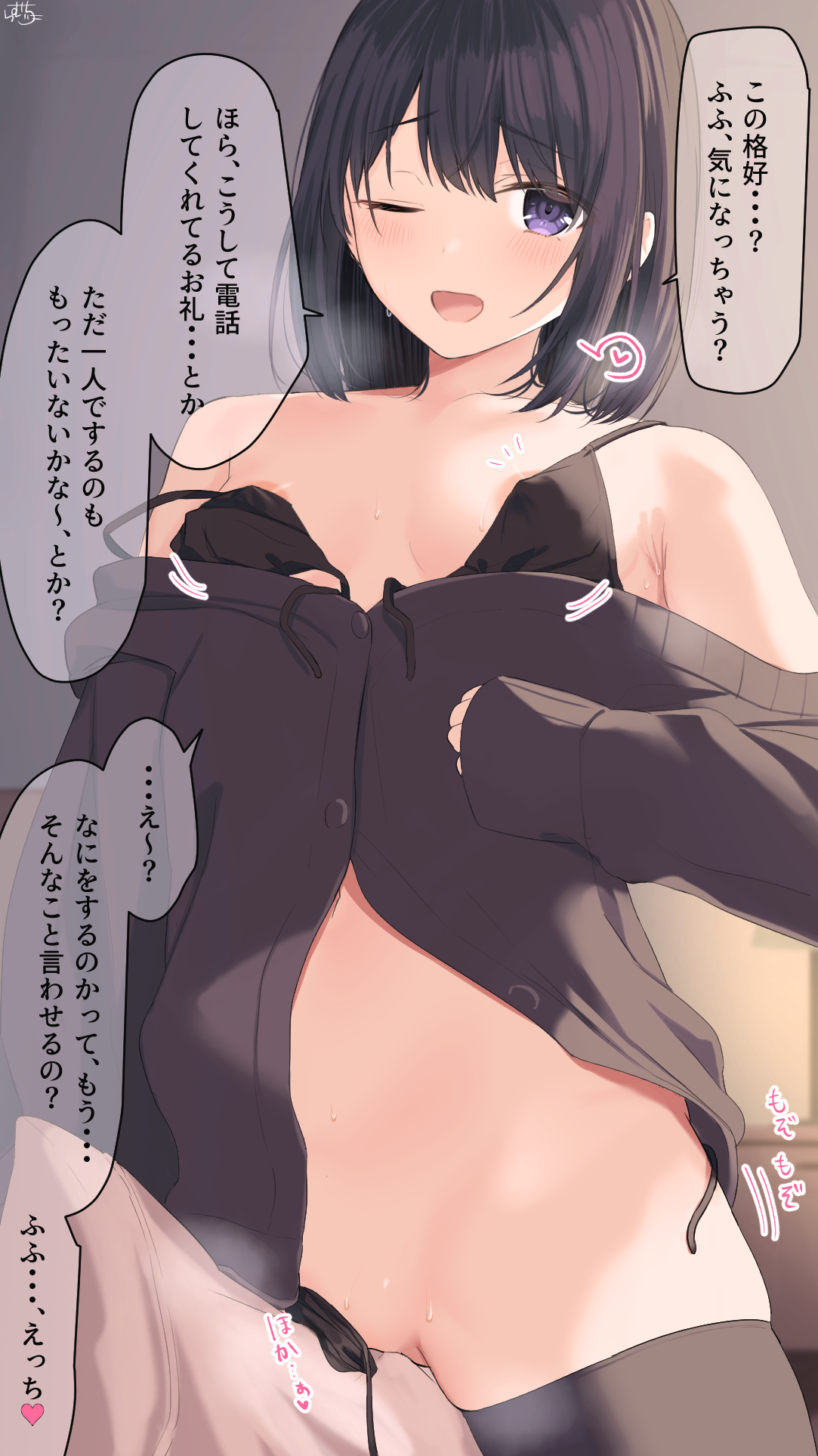 1boy1girlareola sliparmpit creasebare shouldersbikiniblack bikiniblack hairblack thighhighsblushbreastscollarbonehair between eyesheartlong sleevesmedium hairmidriffmotion linesnotice linesone eye closedopen mouthpartially undressedpurple eyesraised inner eyebrowssmall breastsspeech bubblesteamstraddlingstrap slipsweatswimsuitthighhighsuntied bikini bottomuntied bikini top