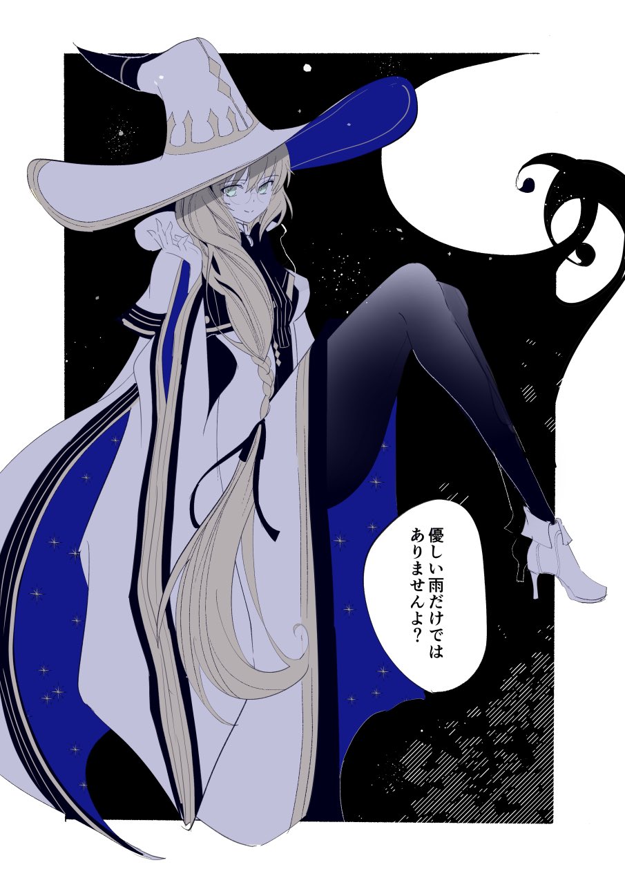 1girlblack pantyhoseblonde hairblue eyesbraidglasseshair between eyeshathigh heelslong hairlooking at viewerpantyhoserobesingle braidsmilesolovery long hairwitch hat