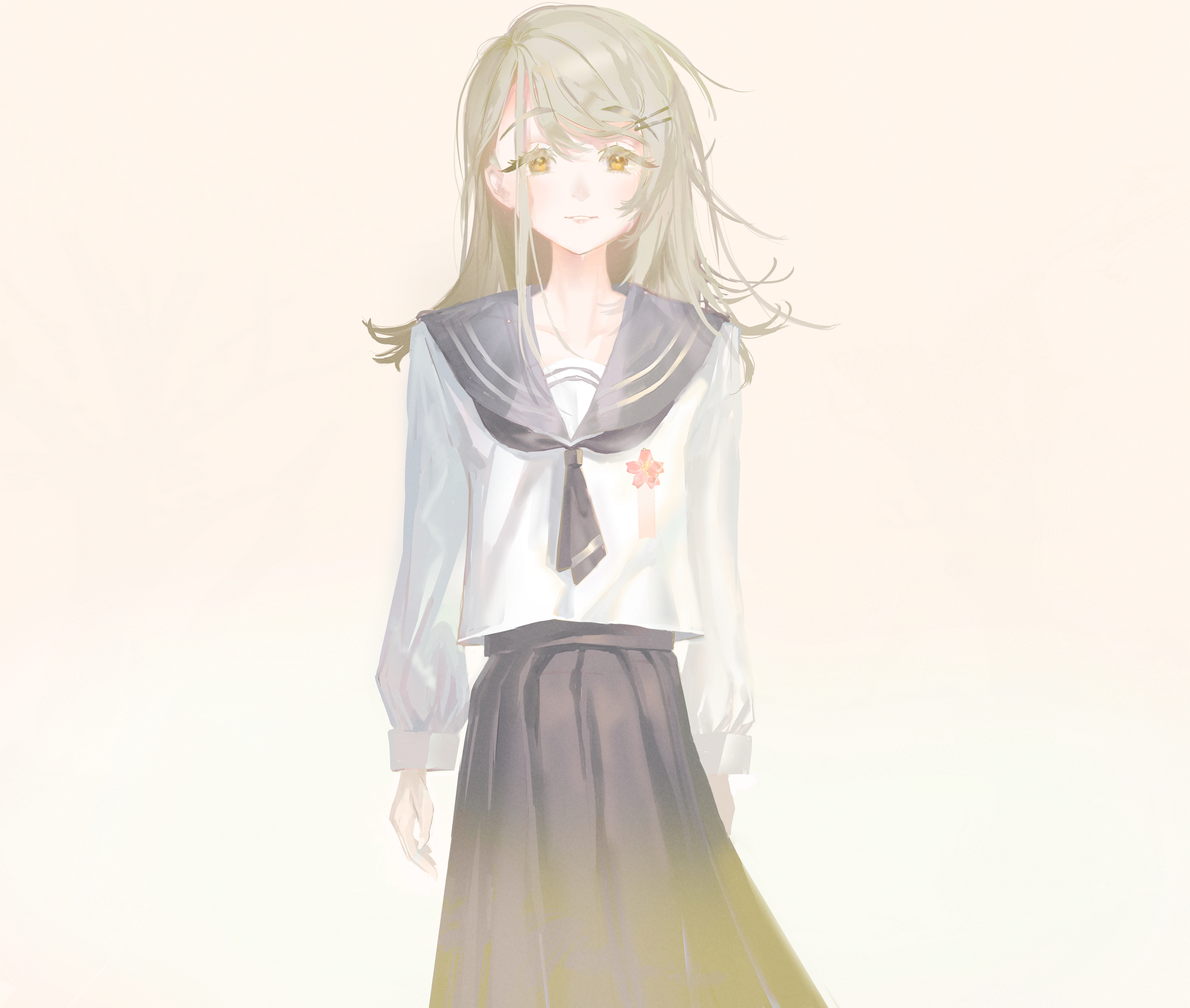 1girlflat chestgrey hairlight smilelong hairlooking at viewerorange eyesparted lipsschool uniformserafukuskirtsolosuperhoikoro