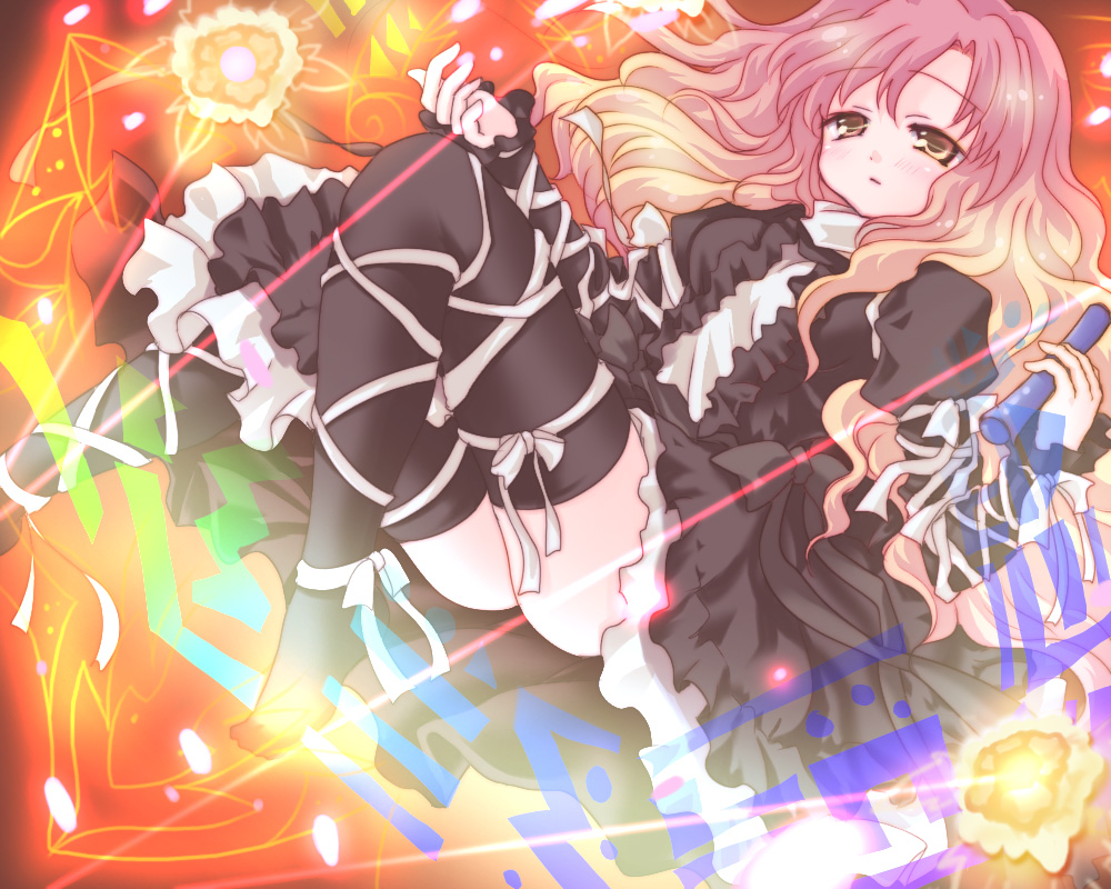 1girlblack thighhighscurly hairdressfemale focusglowinggradient hairlong hairmulticolored hairribbonscrollsolosorcerer's sutra scrollthighhighsupskirtwavy hairyellow eyes
