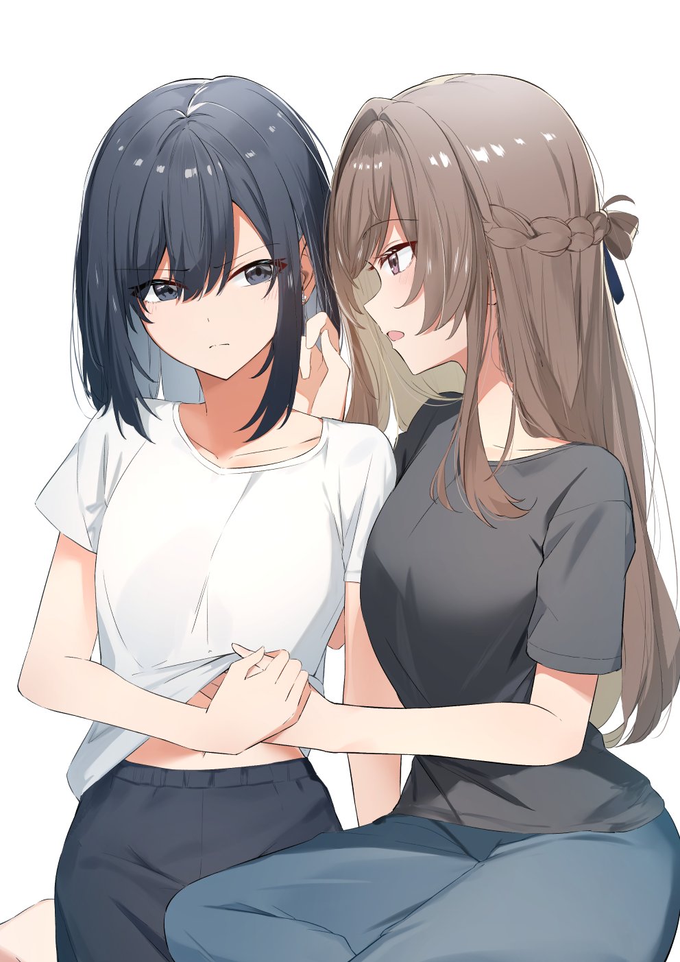2girlsblack eyesblack hairblack shirtblue pantsbraidbrown eyesbrown hairclothes lifthalf up braidhand in another's hairhand on another's stomachholding handslong hairlooking at anothermedium hairmultiple girlsopen mouthpantsshirtshirt liftsimple backgroundwhite backgroundwhite shirtyuri