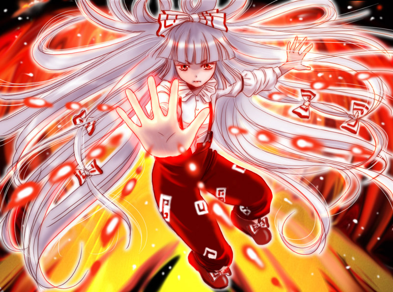 1girlbowdanmakufemale focusfiery wingsfirehair bowhair ribbonlong hairmultiple hair bowsofudapantsred eyesribbonsolosuspendersvery long hairwings