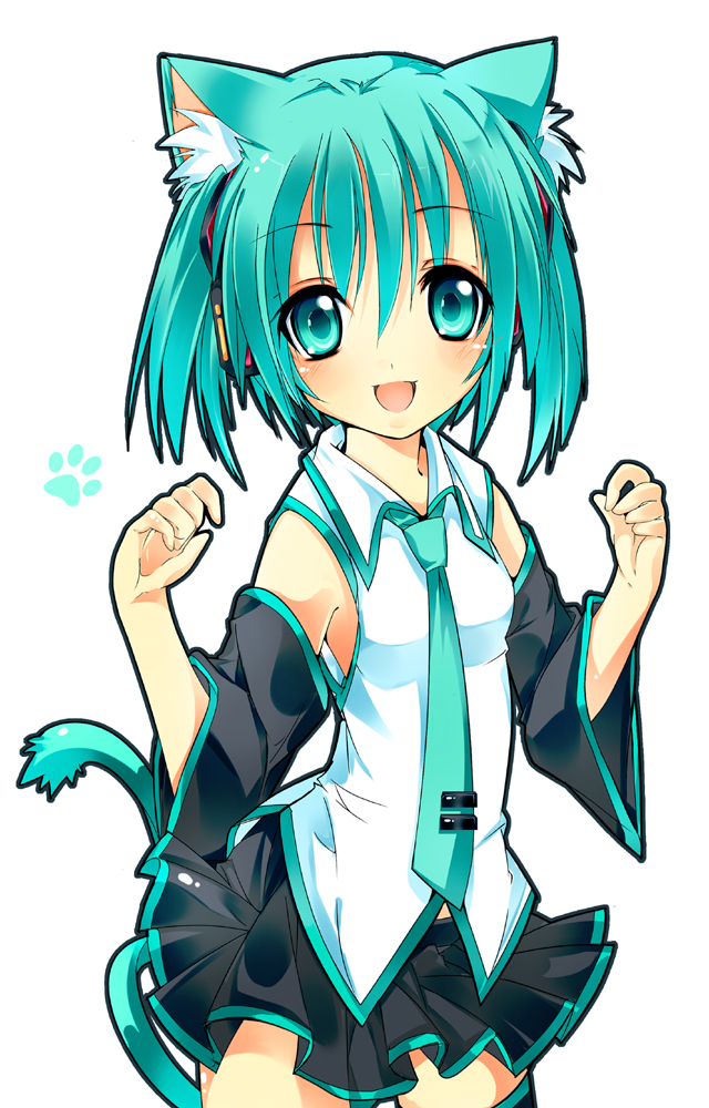 1girlaged downalternate hair lengthalternate hairstyleanimal earsaqua eyesaqua haircat earscat tailchilddetached sleevesfemale focuskemonomimi modenecktieopen mouthpaw printshort hairskirtsolotailthighhighs