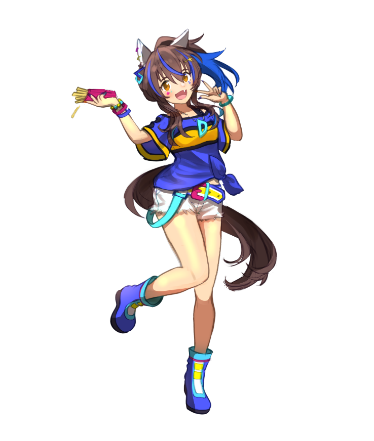 1girlanimal earsblue hairblue shirtblushbootsbraceletbreastsbrown haircolored inner hairear coversear ornamentfacial tattoofangfoodfrench friesfull bodyhair between eyeshair ornamenthairclipholdingholding foodhorse earshorse girlhorse tailjewelrylong hairlooking at viewermulticolored hairmulticolored nailsnecklaceopen mouthshirtshortsside ponytailsimple backgroundsmilesolostar (symbol)star hair ornamentstreaked hairtailtattootied shirtwwhite backgroundwhite shortsyellow eyes