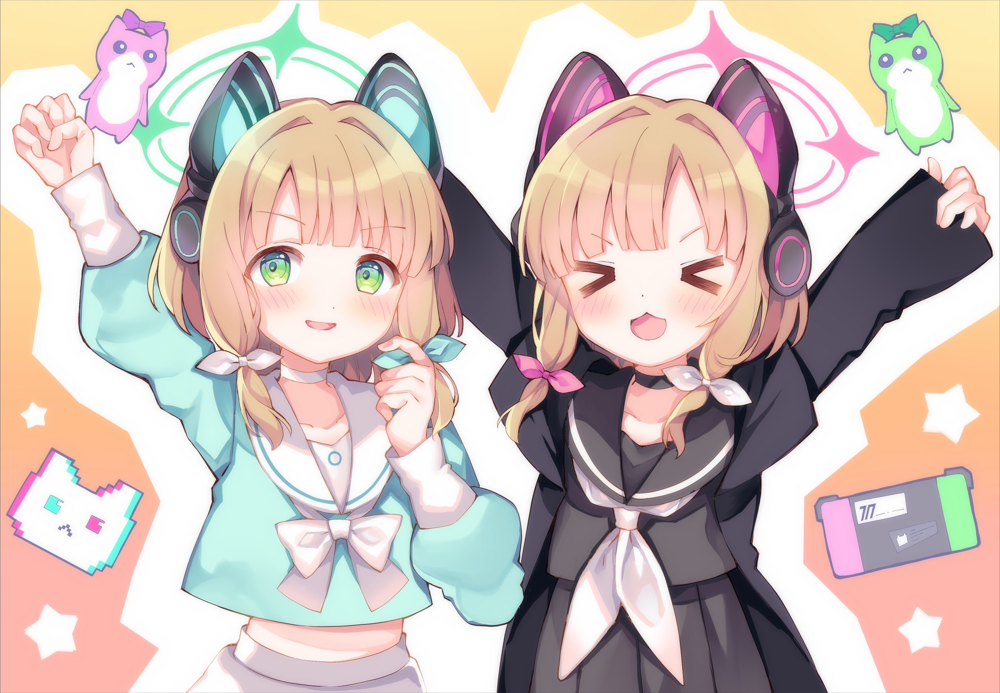 :d1boy2girlsaqua bowaqua shirtarm uparms uparona (blue archive) (cosplay)black chokerblack coatblack sailor collarblack serafukublack skirtblonde hairblushbowbowtiechokercoatcollarbonecosplayfacing viewergradient backgroundgreen eyesgreen halohair bowhalohand uphandheld game consolehappylong sleeveslooking at viewerlow-tied sidelocksmedium hairmidriffmultiple girlsneckerchiefopen clothesopen coatopen mouthorange backgroundoutlineparted bangspinching sleevespink bowpink haloplana (blue archive) (cosplay)pleated skirtraised fistsailor collarschool uniformserafukushirtsiblingssidelockssistersskirtsleeves past wristssmilestar (symbol)thick outlinestwinsupper bodyv-shaped eyebrowswhite bowwhite bowtiewhite chokerwhite neckerchiefwhite outlinewhite sailor collarwhite skirtxd