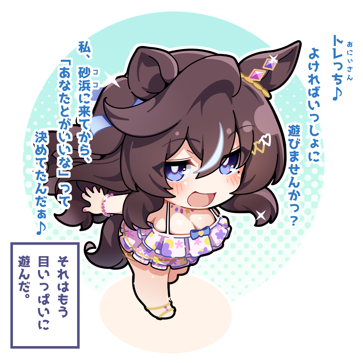 :d1girlanimal earsbikiniblue eyesblushbraceletbreastsbrown hairchibichibi onlycleavagedouble-parted bangsfull bodyhair between eyeshorse earshorse girlhorse tailjewelrylong hairlooking at vieweropen mouthpurple bikinismilesolostandingswimsuittail