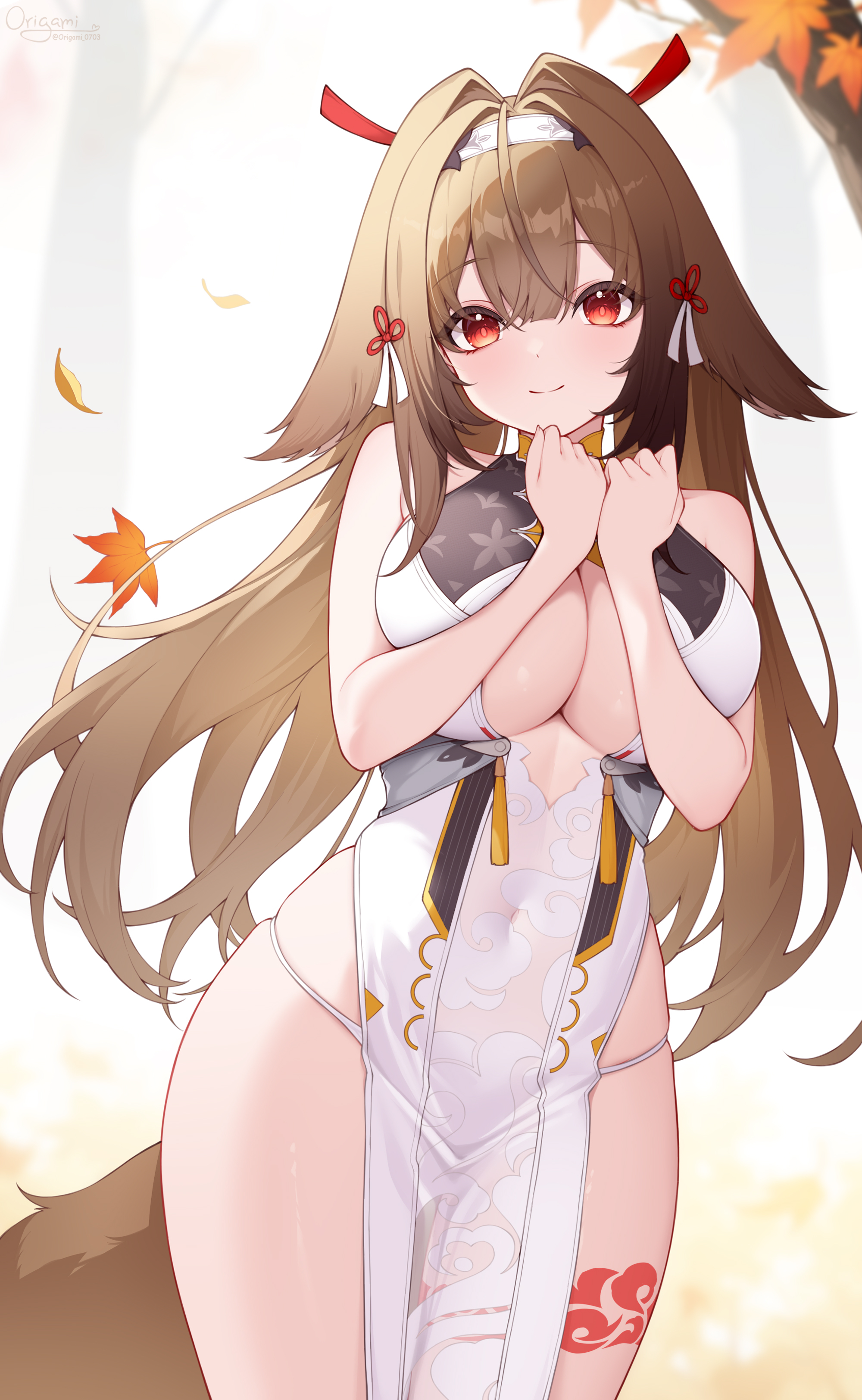 1girlanimal earsbreast pressbreastsbrown hairbrown tailchina dresschinese clothescleavage cutoutclothing cutoutcovered naveldressdroopy earsfox earsfox girlhairbandhands uphigh-waist dresslarge breastslong hairpelvic curtainred eyessmilesolotailwhite backgroundwhite hairband