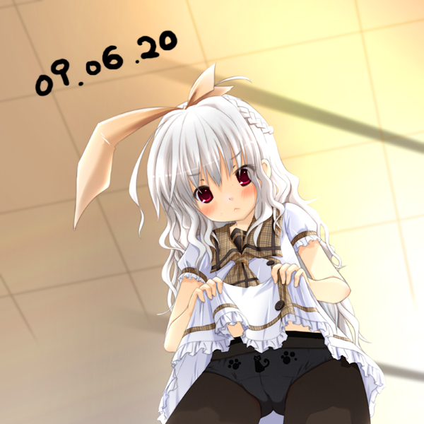 1girlclothes liftcrotch seamfemale focusfrom belowhair ribbonlong hairpantiespanties under pantyhosepantyhoseprint pantiesred eyesribbonschool uniformskirtskirt liftsolounderwearwhite hair