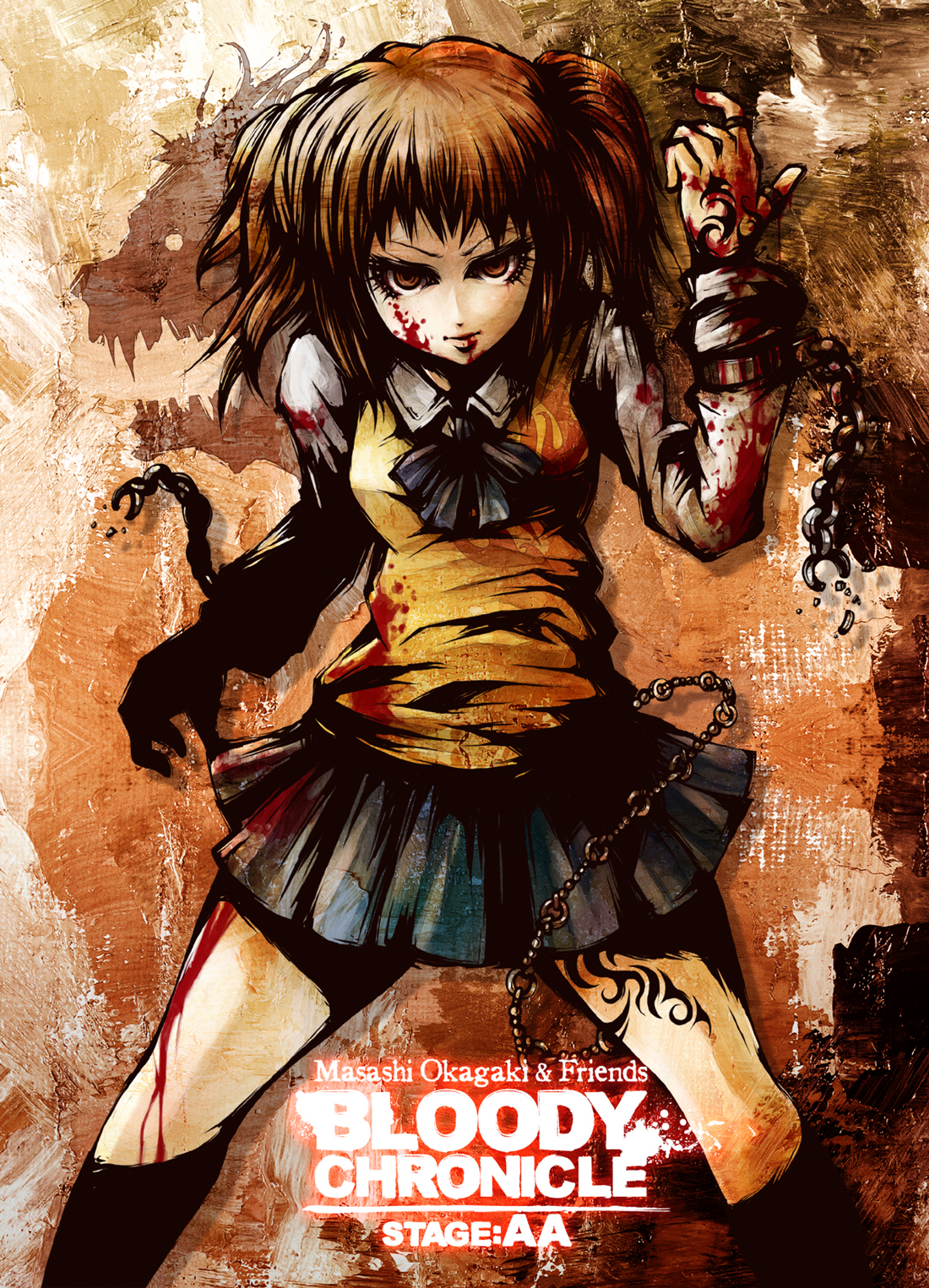 00salbum coverbloodbrown hairchaincoverminiskirtred eyesschoolschool uniformskirtsolotattootwintailstwo side up