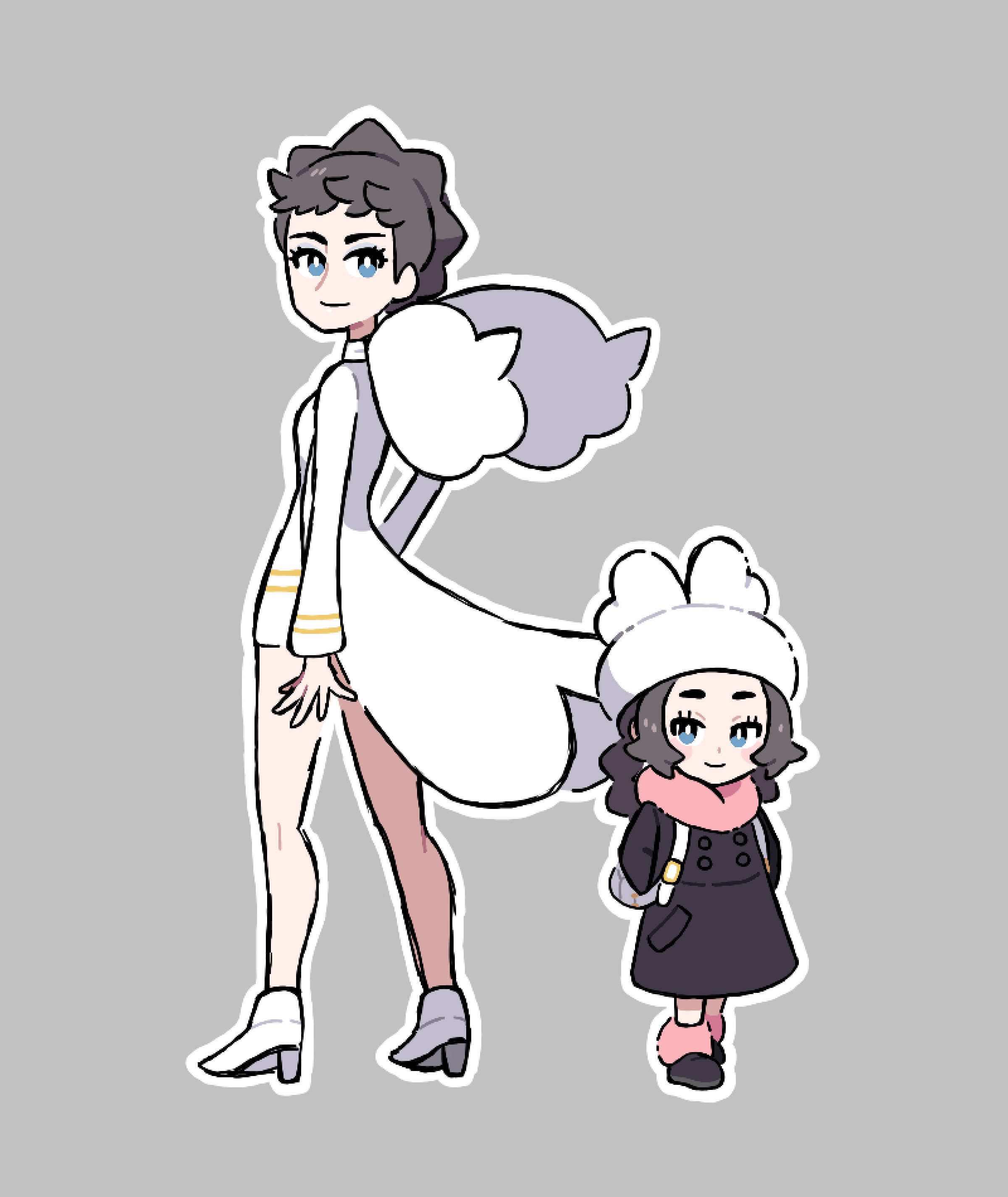 2girlsbackpackbagblue eyesbright pupilsfull bodygrey backgroundhathigh heelsjacketmother and daughtermultiple girlsoutlinescarfsmilestanding