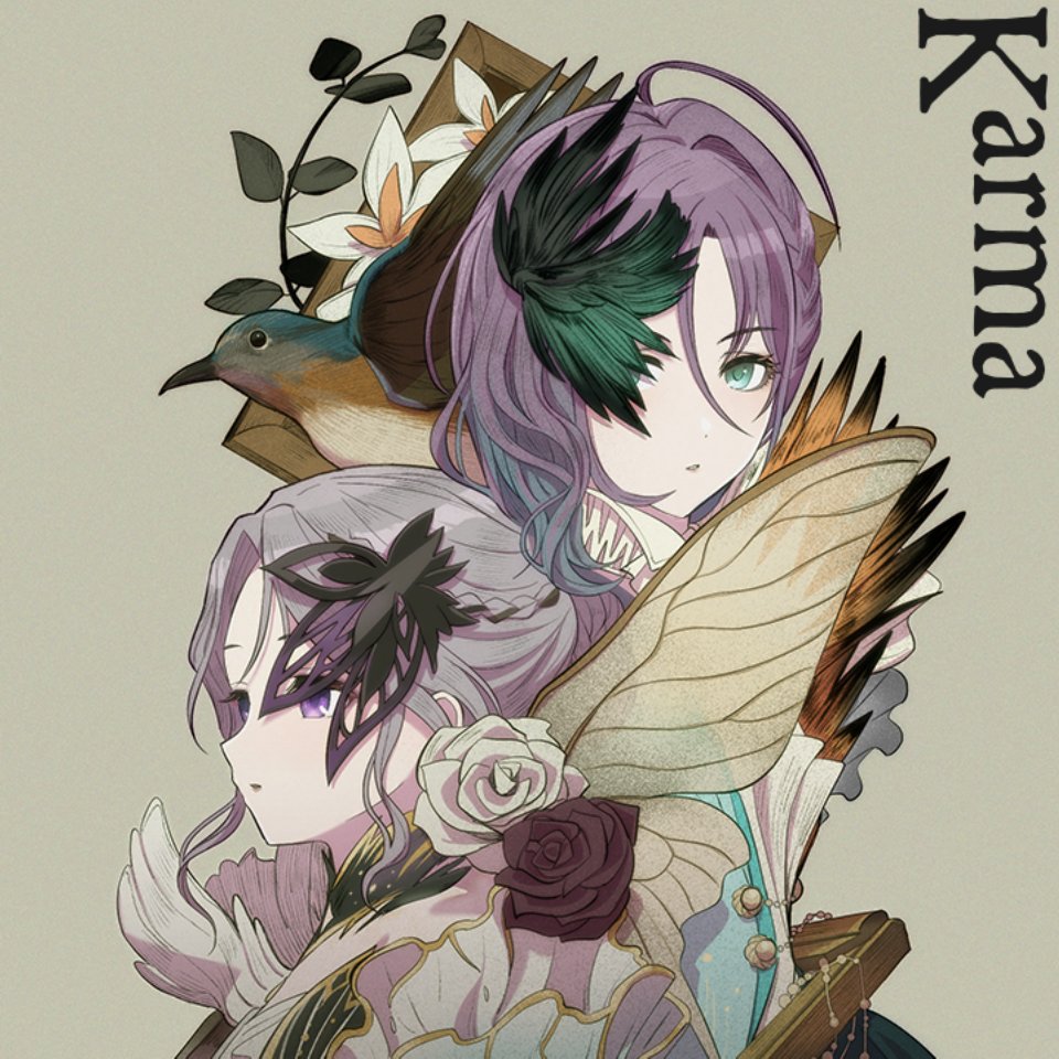 2girlsalbum coverbare shouldersbirdblue eyesbraceletbugbutterflycoverearringsfeather hair ornamentfeathersflowerfumage (idolmaster)green backgroundhair ornamentinsectjewelrylong hairmultiple girlsopen mouthpearl braceletpurple flowerpurple hairpurple roserose