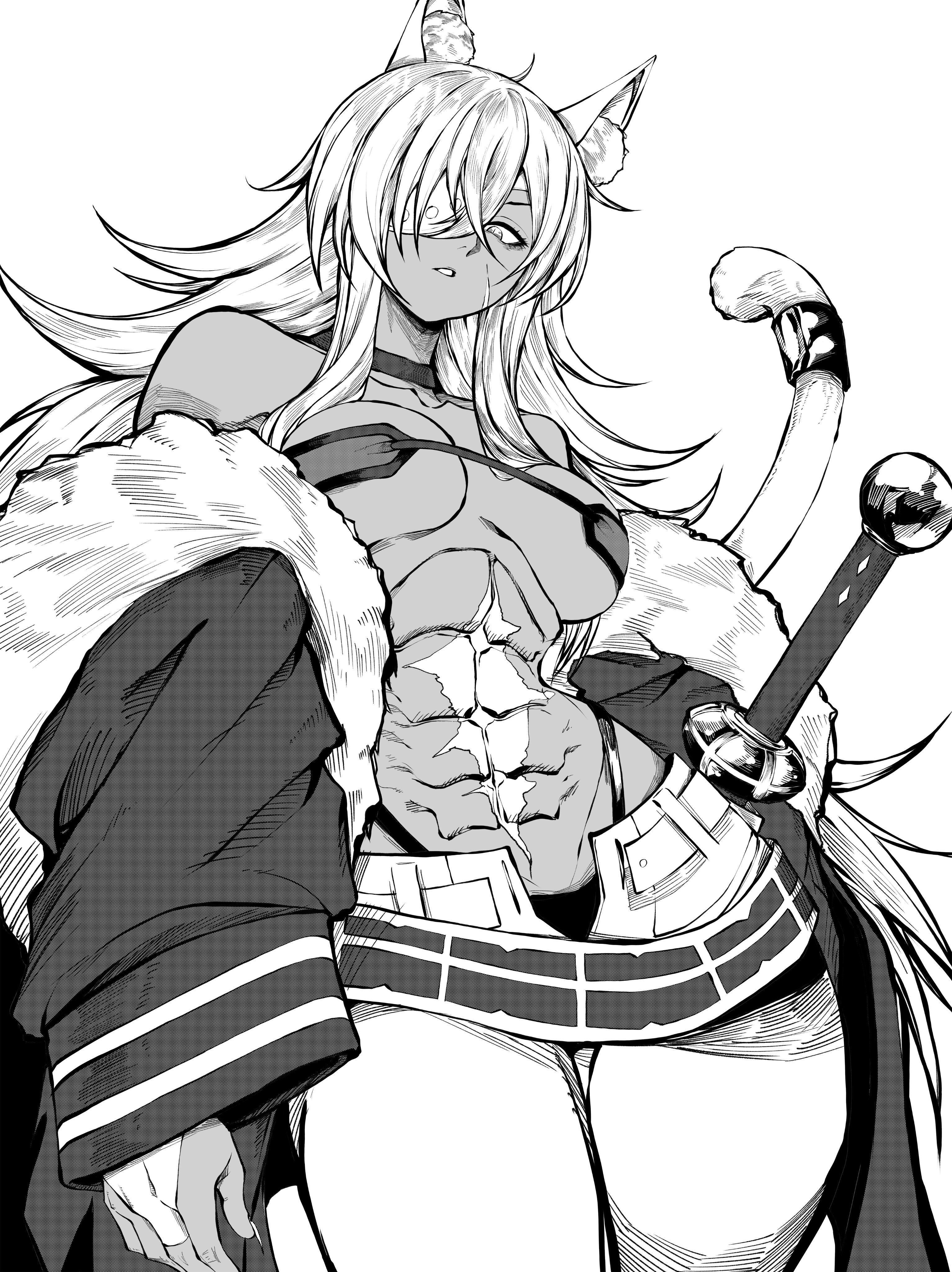 1girlabsahogeanimal earsbandeaubare shouldersbeltbreastscat earscat girlcat tailchokercollarbonecrossed bangsfacial scarfur trimfur-trimmed jacketgreyscalehair between eyeshighleghighleg pantiesjacketlarge breastslong hairlooking at viewermonochromemuscularmuscular femalenaveloff shoulderopen flypantiespantsparted lipsscarscar on cheekscar on facescar on stomachsheathsheathedsolostomachswordtailtail ornamenttail ringunderwearvery long hairweapon