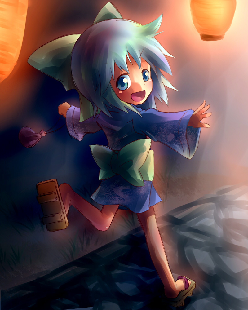 :d1girlblue eyesblue hairbowfemale focusgetahair bowjapanese clotheskimonolanternmatching hair/eyesopen mouthpaper lanternpouchrunningshort hairsmilesolo