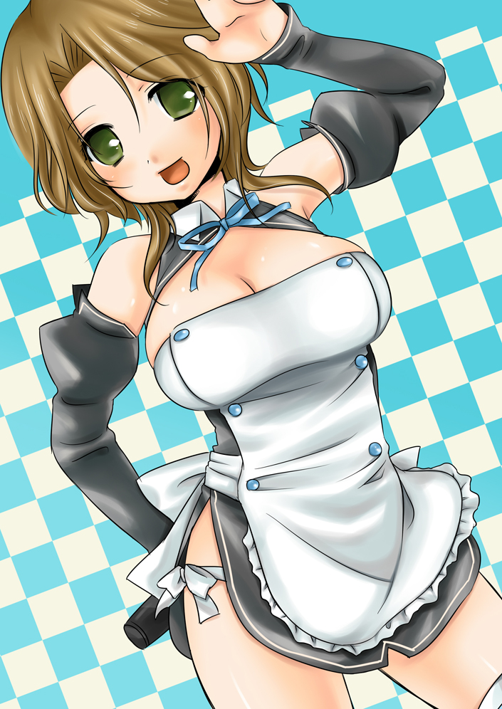 1girlapronarmpitsbreastsbrown haircleavagedetached sleeveselbow glovesfemale focusglovesgreen eyeslarge breastsmaidmaid apronmicrophonepantiesshort hairside-tie pantiessmilesolothighhighsunderwearwavingwhite panties