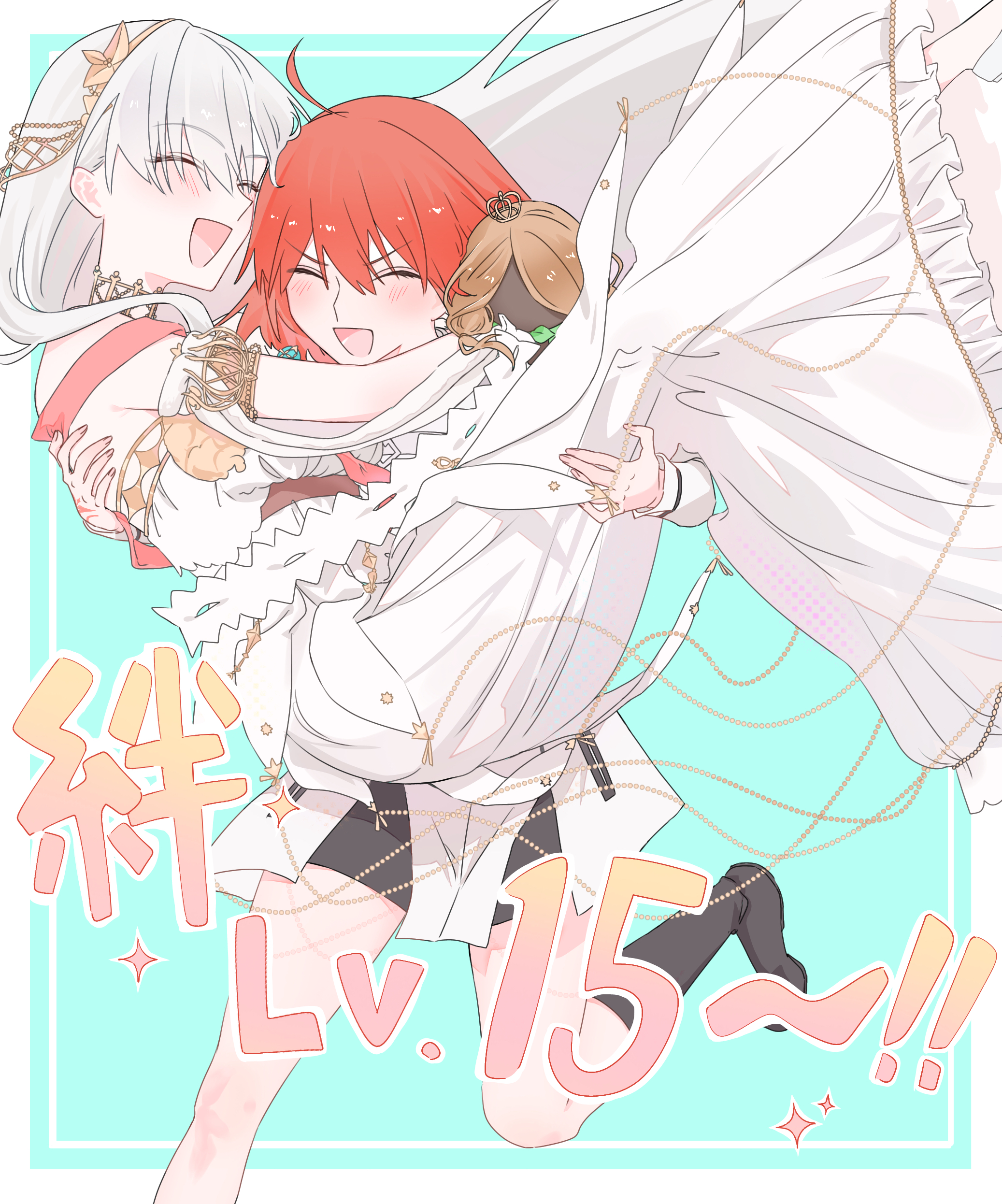 2girlsahogeblack bootsblue backgroundbootscarryingclosed eyesdressgold hairbandhairbandlong dressmultiple girlsorange hairprincess carryrunningwhite dresswhite hair