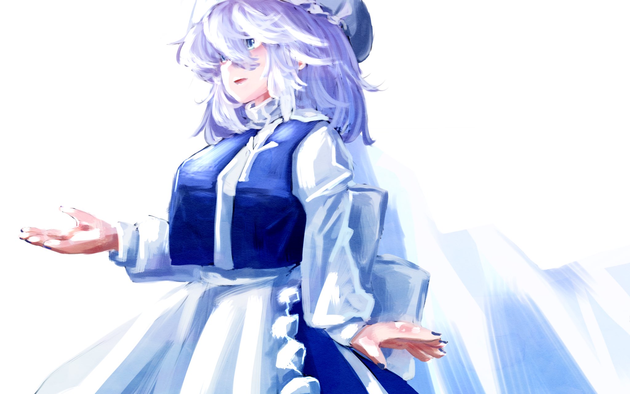 1girlapronblue vestlapel pinlong sleeveslooking to the sidemedium hairshirtsolovestwaist apronwhite backgroundwhite shirt